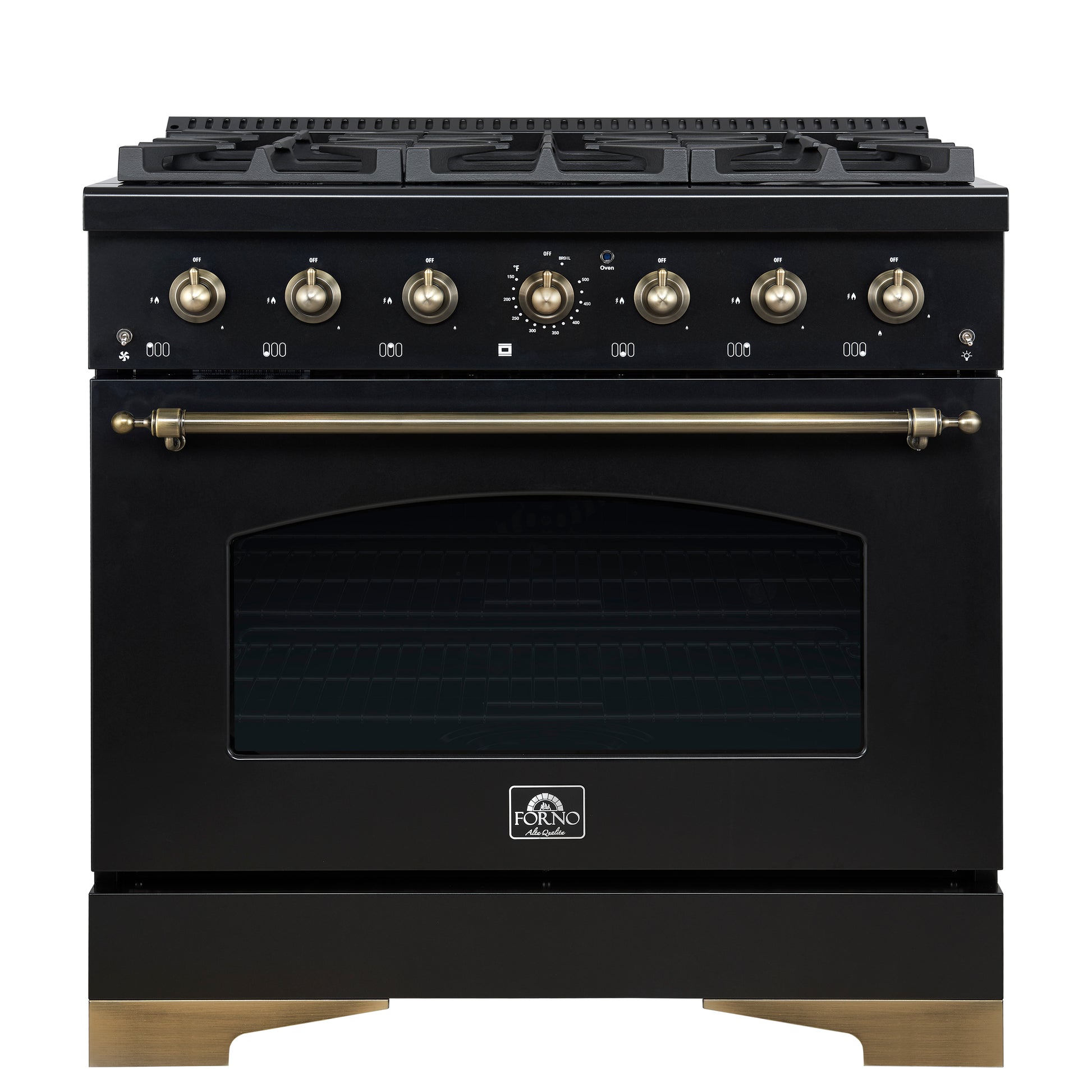 Forno Antico 36-inch Freestanding Gas Range Black and Antique Brass Design, 6 Sealed Burners 71,000 BTU, 4.5 cu.ft. Convection Oven