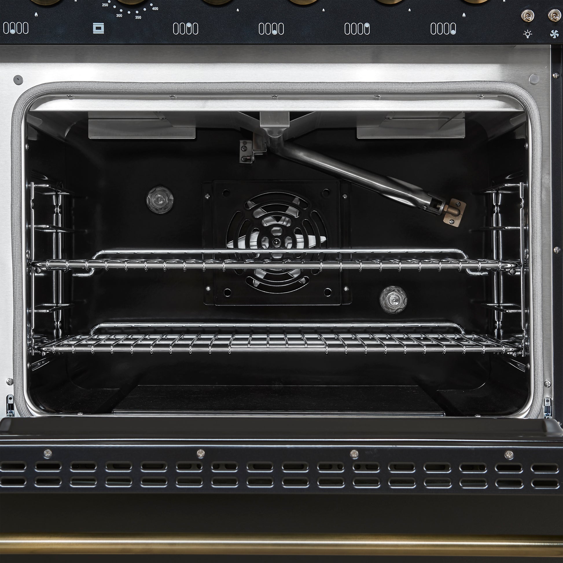 Elevate your cooking experience with the Forno Antico 48-Inch Gas Range. Featuring 8 sealed burners with a total output of 94,000 BTU, this range offers exceptional power and precision. Equipped with two dual-ring brass burners, it delivers up to 20,000 BTU for searing and as low as 1,000 BTU for delicate simmering, giving you unmatched versatility. The 3.5 cu.ft. convection oven and an additional 2 cu.ft. oven ensure ample space for all your baking and roasting needs. With a sleek black finish paired with antique brass accents, this range combines modern elegance with vintage charm. Continuous cast-iron grates provide stability, while the recessed enamel cooktop makes cleaning effortless. Backed by Forno's 2-year warranty, the Antico Gas Range delivers professional-grade performance and timeless design. Forno, lower the cost of living.