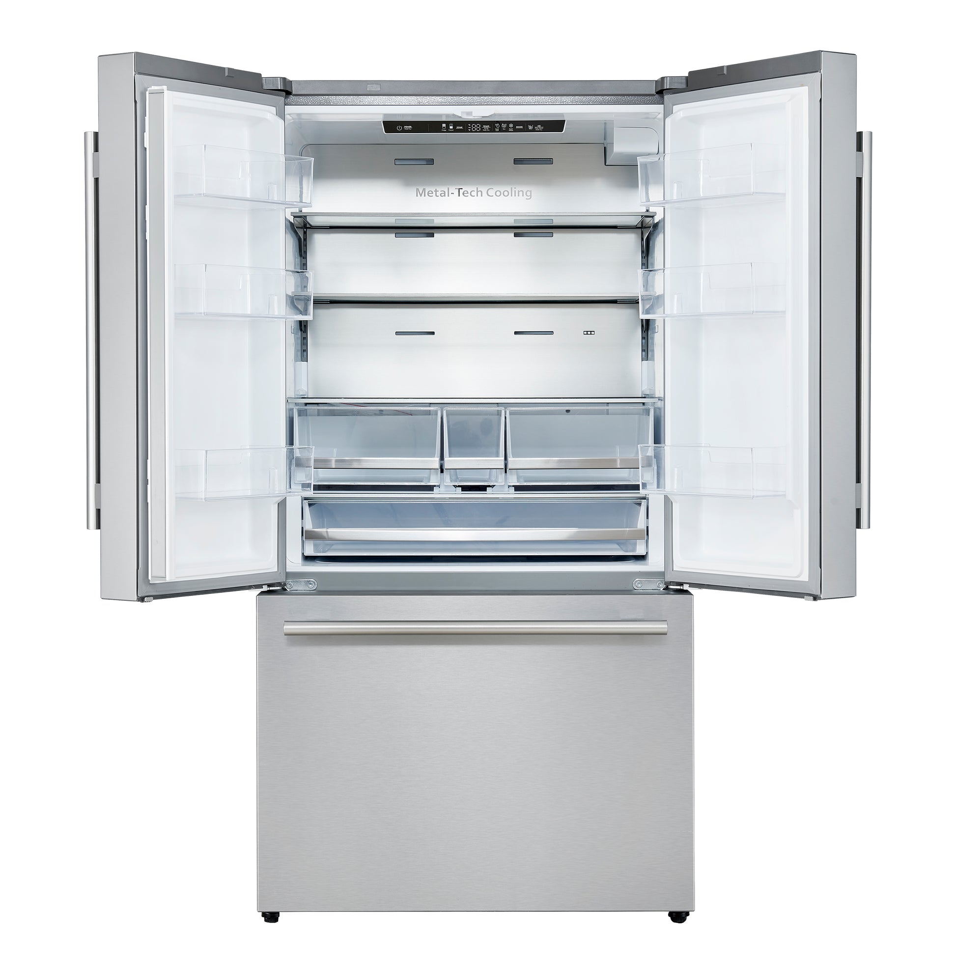 Enhance your kitchen with the Forno Aosta 36-Inch French Door Refrigerator. Offering 15.5 cu.ft. of fresh food storage and 6.9 cu.ft. of freezer space, it meets all your grocery needs. The fresh food compartment features 2 crisper drawers, a snack drawer, and a deli drawer for optimal organization. Cantilever adjustable shelves and a premium stainless steel back panel with silver trim add versatility and style. The freezer offers 3-tier metal glide drawers and an extra extendable tray to store large items like pizza boxes. With an automatic ice maker producing 2.6 lbs daily and an external water dispenser, enjoy convenient access to chilled water and ice. Super Cool and Super Freeze functions ensure groceries stay fresh longer. Backed by Forno's 2-year warranty, this ENERGY STAR-certified refrigerator combines efficiency, durability, and sleek design. Lower the cost of living with Forno Appliances.