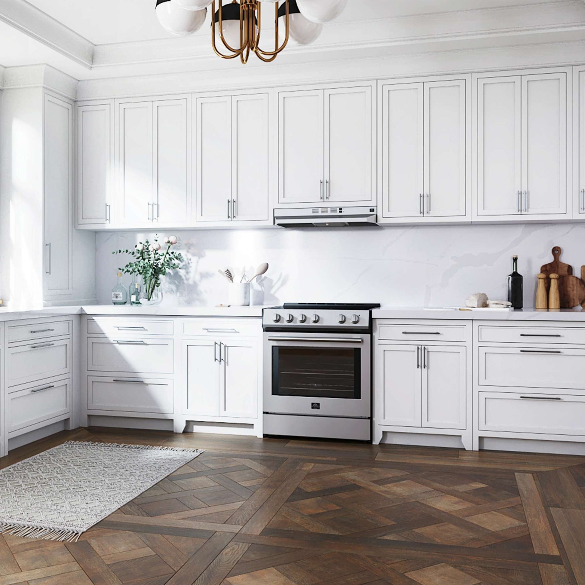 The Forno Cappa 30" Under Cabinet Range Hood in stainless steel blends powerful performance with a compact, sleek design, ideal for small kitchens and apartments. Featuring a 2-speed exhaust fan, it effectively removes smoke and odors while operating quietly at 54 dB. The unit offers flexible installation with both ducted and ductless options, complete with dishwasher-safe aluminum mesh filters and a carbon filter for enhanced air quality. Its ultra-slim 4.7" height saves space and fits perfectly under any cabinet. Bright 2W LED lights provide energy-efficient illumination, ensuring clear visibility while cooking. Simple mechanical controls allow easy switching between speeds for customized ventilation. Backed by a 2-year parts and labor warranty, the Forno Cappa range hood is a reliable, stylish choice for any kitchen. Lower the cost of living with Forno.