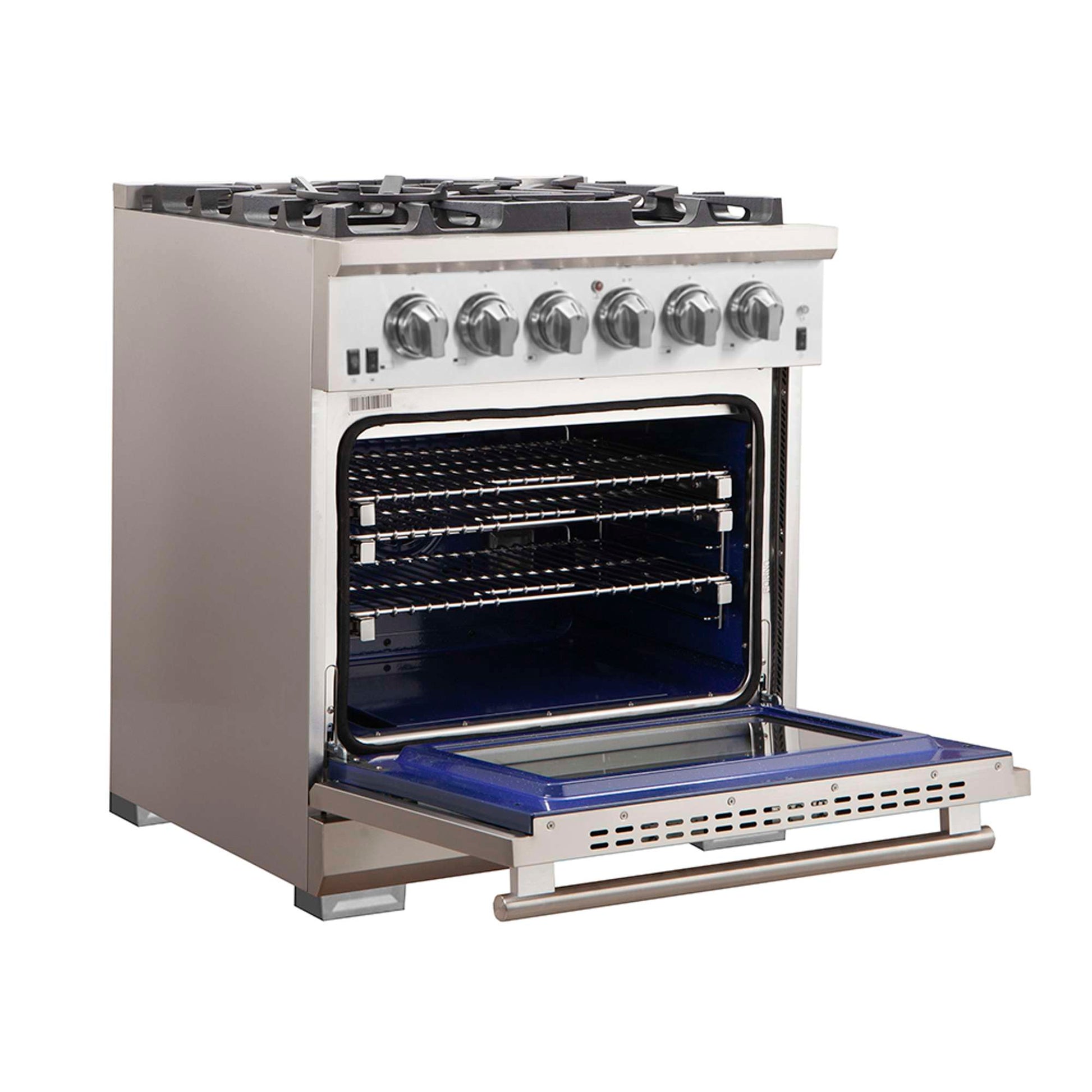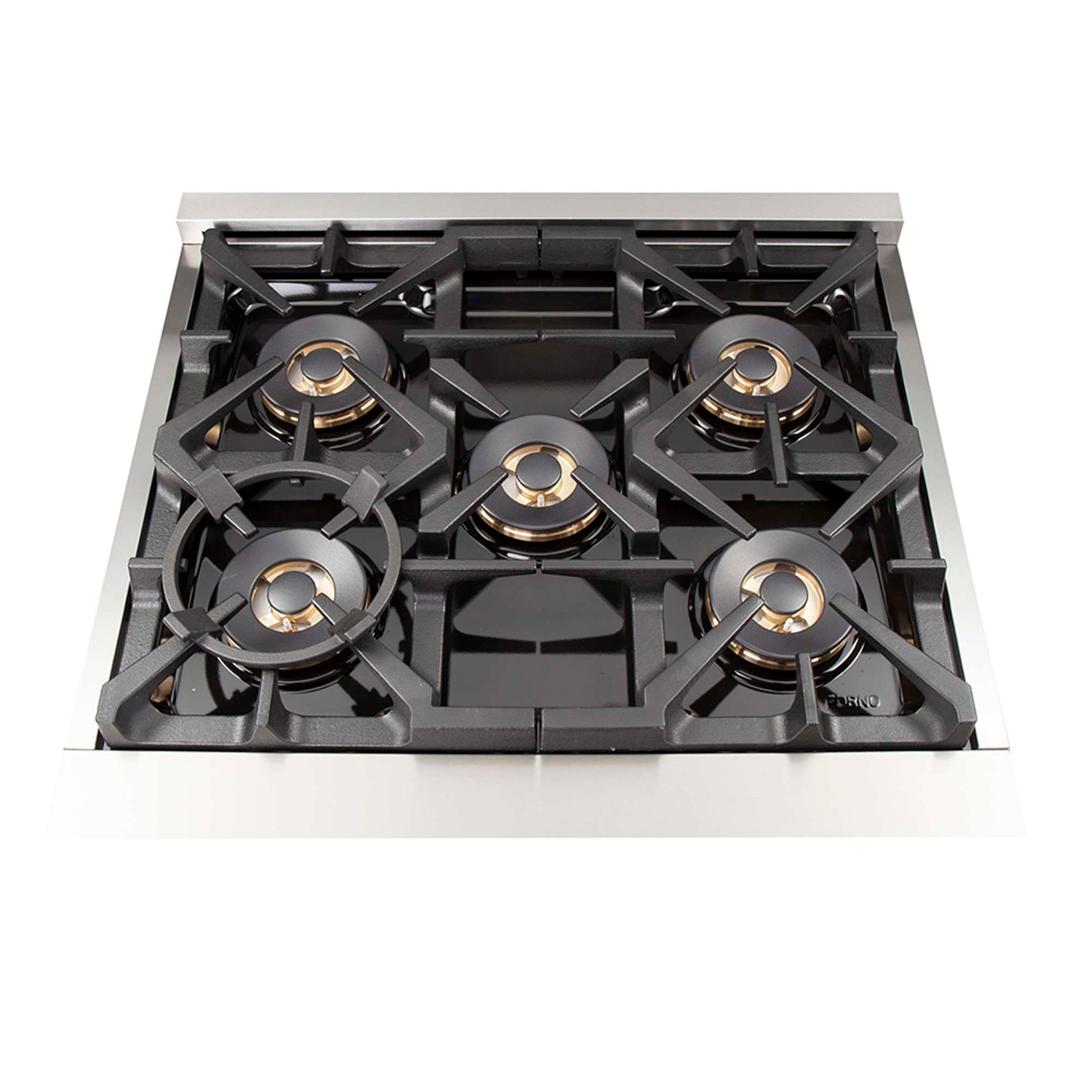 The Forno Capriasca 30 Inch Gas Range enhances your home kitchen with professional styling and performance through its durable and beautiful 304-grade stainless-steel design. The cooking surface features 5 sealed dual-ring brass burners, totaling 100,000 BTU. All burners, each at 20,000 BTU, can simmer precisely at 1,000 BTU. Continuous heavy-duty cast-iron grates facilitate easy sliding of pots or pans off heat over the enamel cooktop cavity, simplifying spill cleanup. The 4.32 cu. ft. gas oven, with a 30,000 BTU output and infrared red mesh broiler, enclosed in a blue enamel interior, offers optional convection for precise, and consistent cooking on multiple levels. For convenient viewing, a 3-layer glass oven door window is included. The package includes 3 telescopic stainless-steel oven racks, wok support, and an LP conversion kit. Additionally, zinc-coated illuminated metal knobs with bezel rings ensure enduring beauty.