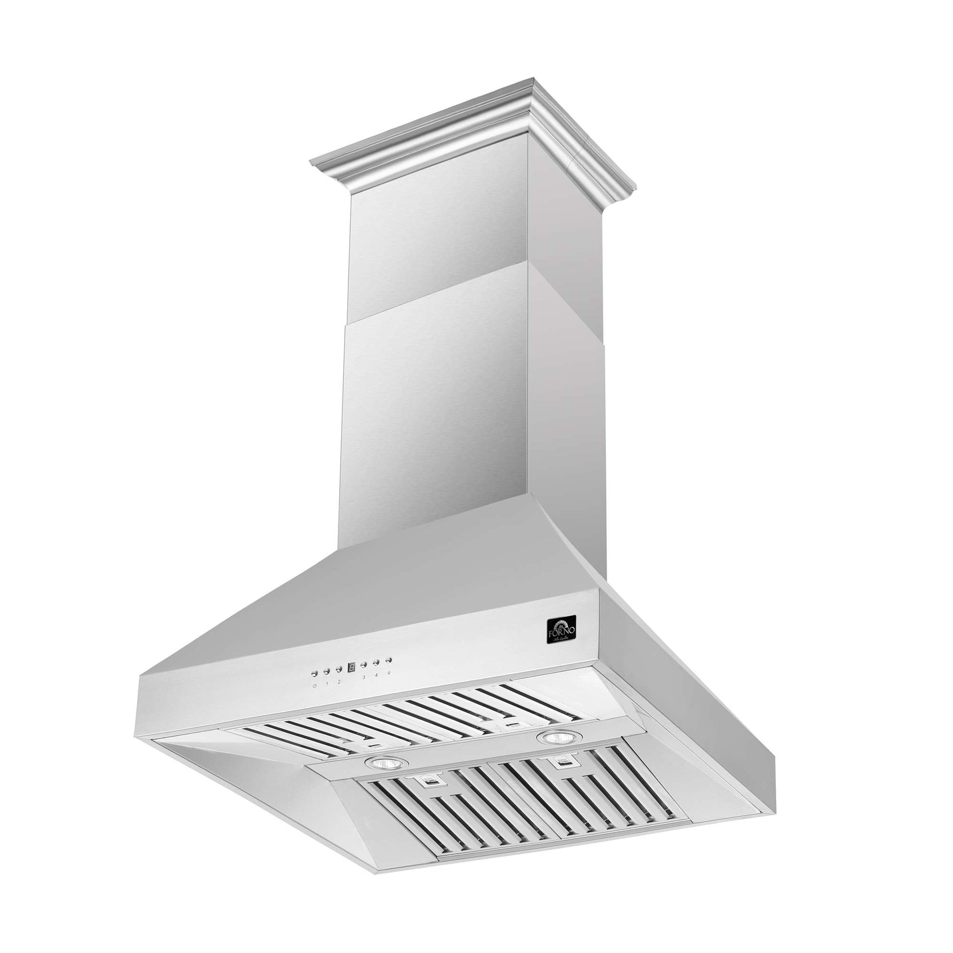 The Coppito 30-Inch Stainless Steel Island Range Hood helps create superior air quality with its powerful 600 CFM motor and four-speed push-button control. The decorative stainless-steel crown molding adds an attractive finish to your kitchen design. The hood is made from high-grade stainless steel for durability, and boasts noise reduction technology for a quieter sound while in use. The included surface lights provide superior illumination and energy efficiency. Baffle filters capture heat, odors, gases and are dishwasher-safe making cleanup a breeze. This range hood is sure to be an asset in any kitchen.