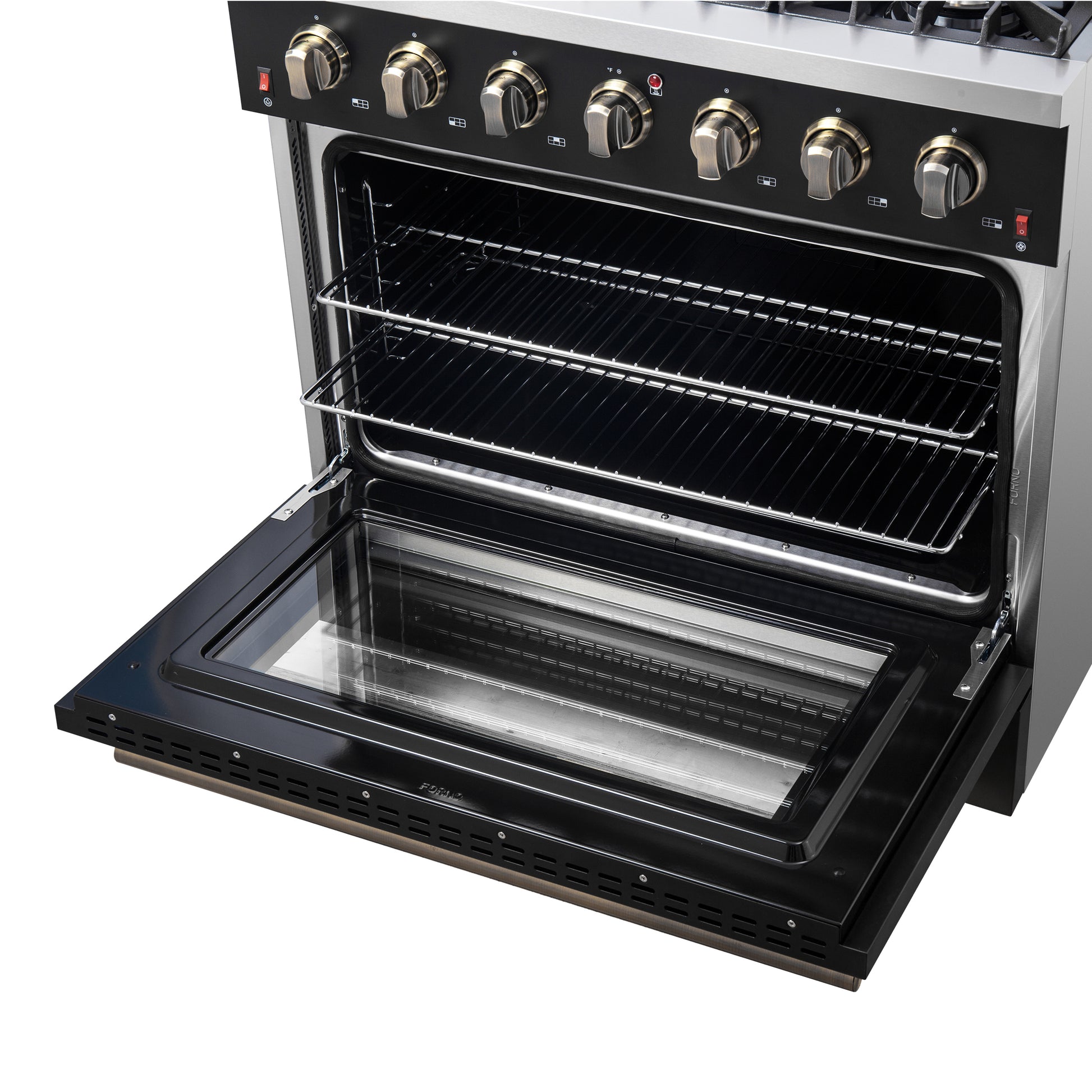 The Forno Galiano 36-Inch Gas Range in sleek black with antique brass hardware elevates your kitchen with a balance of elegance and high performance. The contrasting black front, antique brass knobs and handles, and stainless steel surroundings offer a striking yet refined aesthetic that complements any kitchen design. It boasts 6 sealed burners with a total output of 83,000 BTU, including a 20,000 BTU dual-ring burner for precise simmering at 1,000 BTU. Continuous cast iron grates ensure cookware stability and seamless movement between burners. The spacious 5.26 cu.ft. convection oven offers 30,000 BTU total broil and bake output, a black enamel interior for easy maintenance, and a three-layer tempered glass oven door for optimal heat retention and a clear view inside. Features include two oven racks, a LP conversion kit, and antique brass knobs, blending style with superior functionality. Backed by Forno’s 2-year warranty, this range offers lasting durability and peace of mind. Forno, Lower the cost of living.
