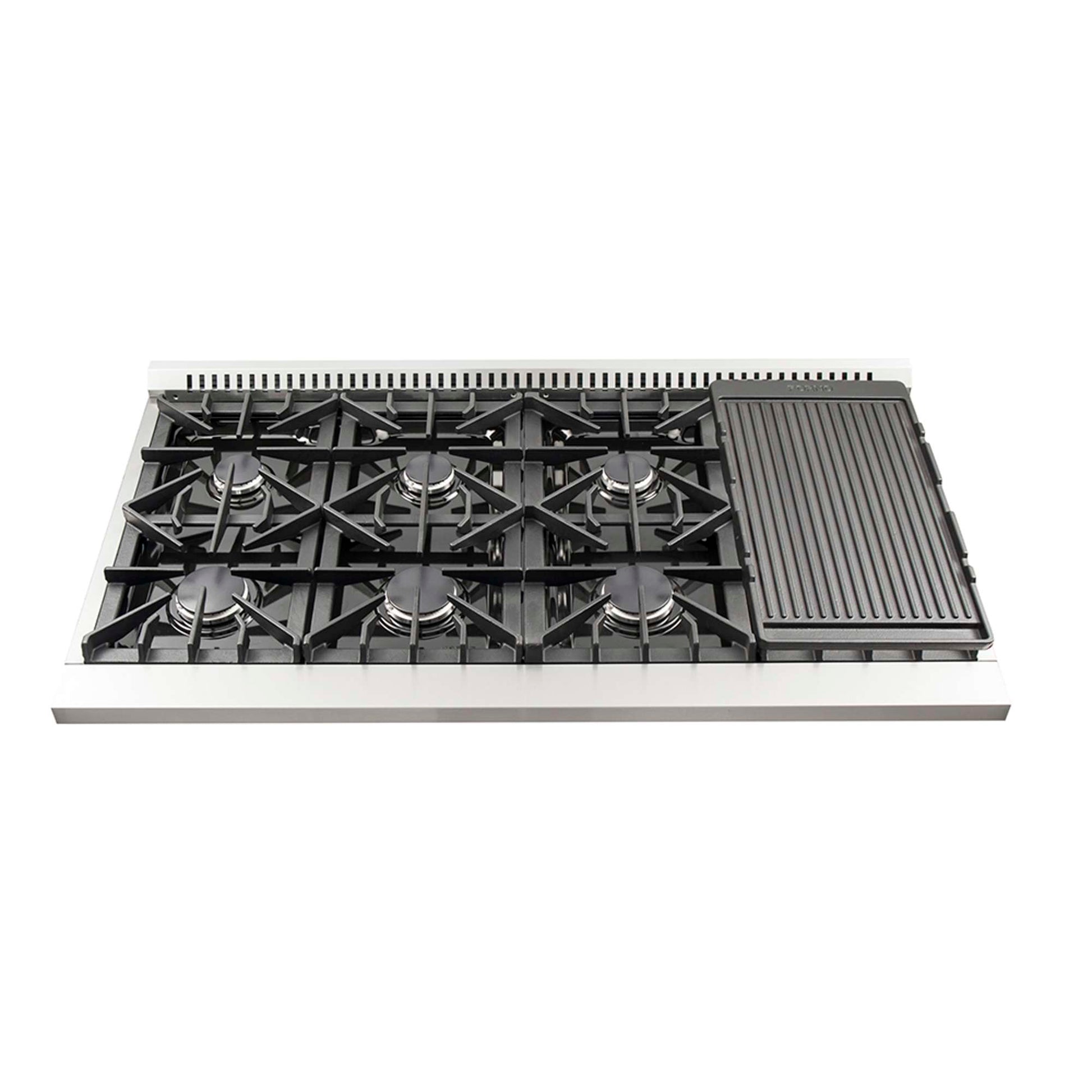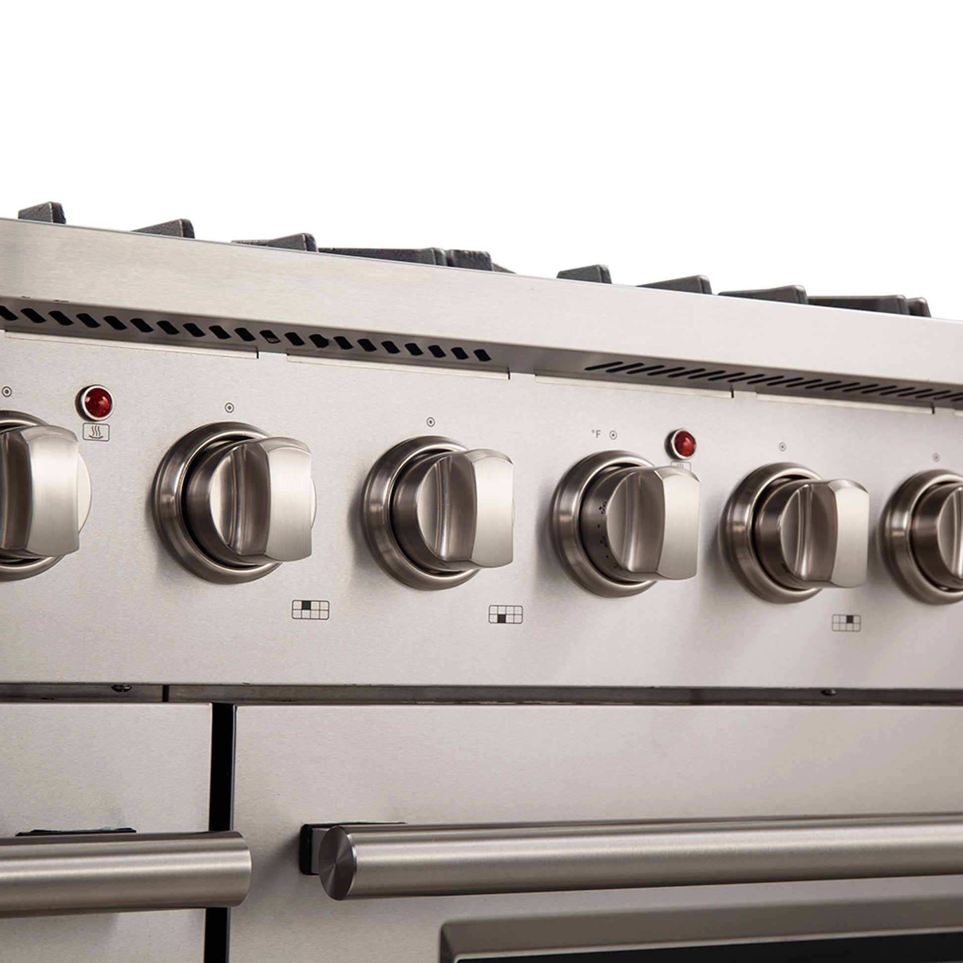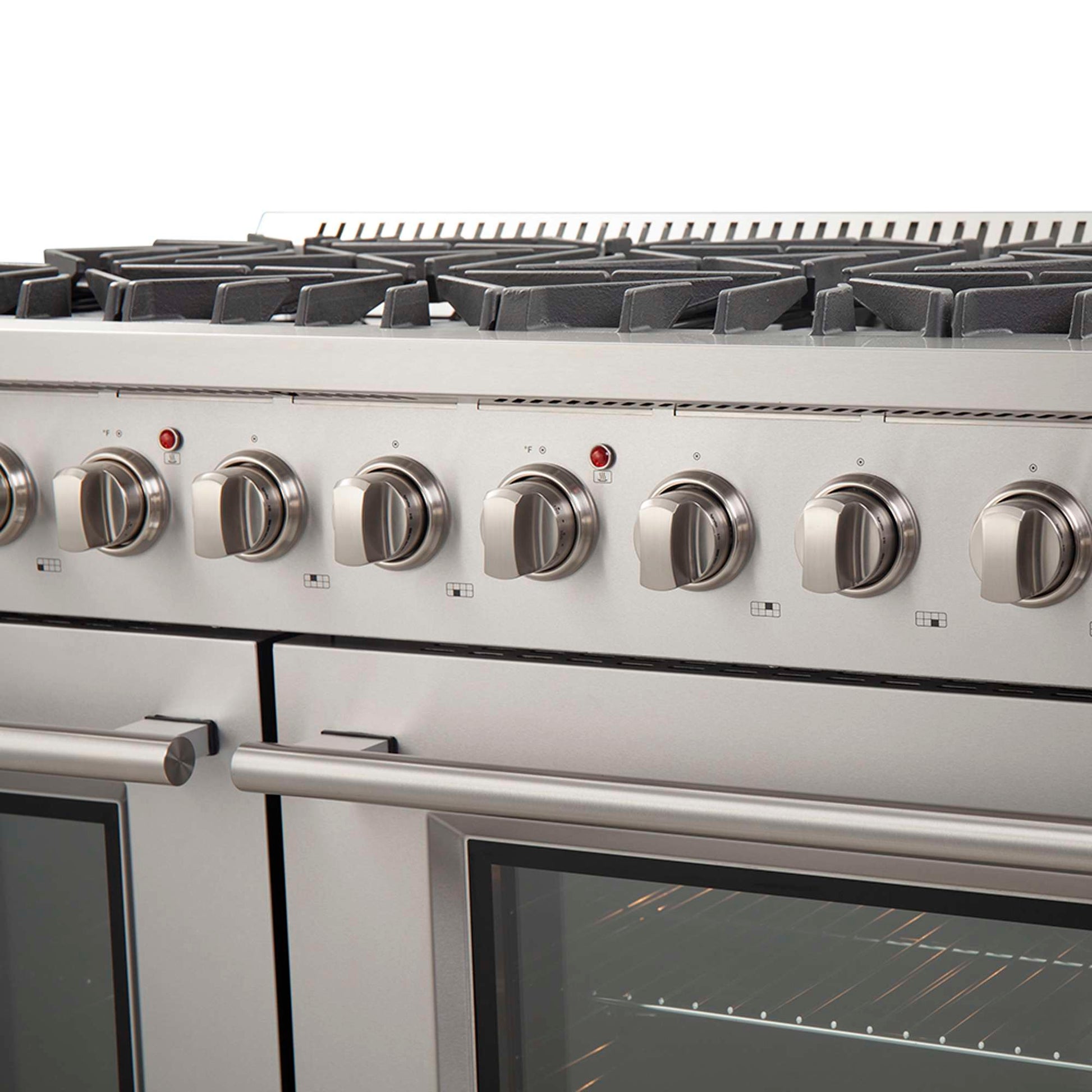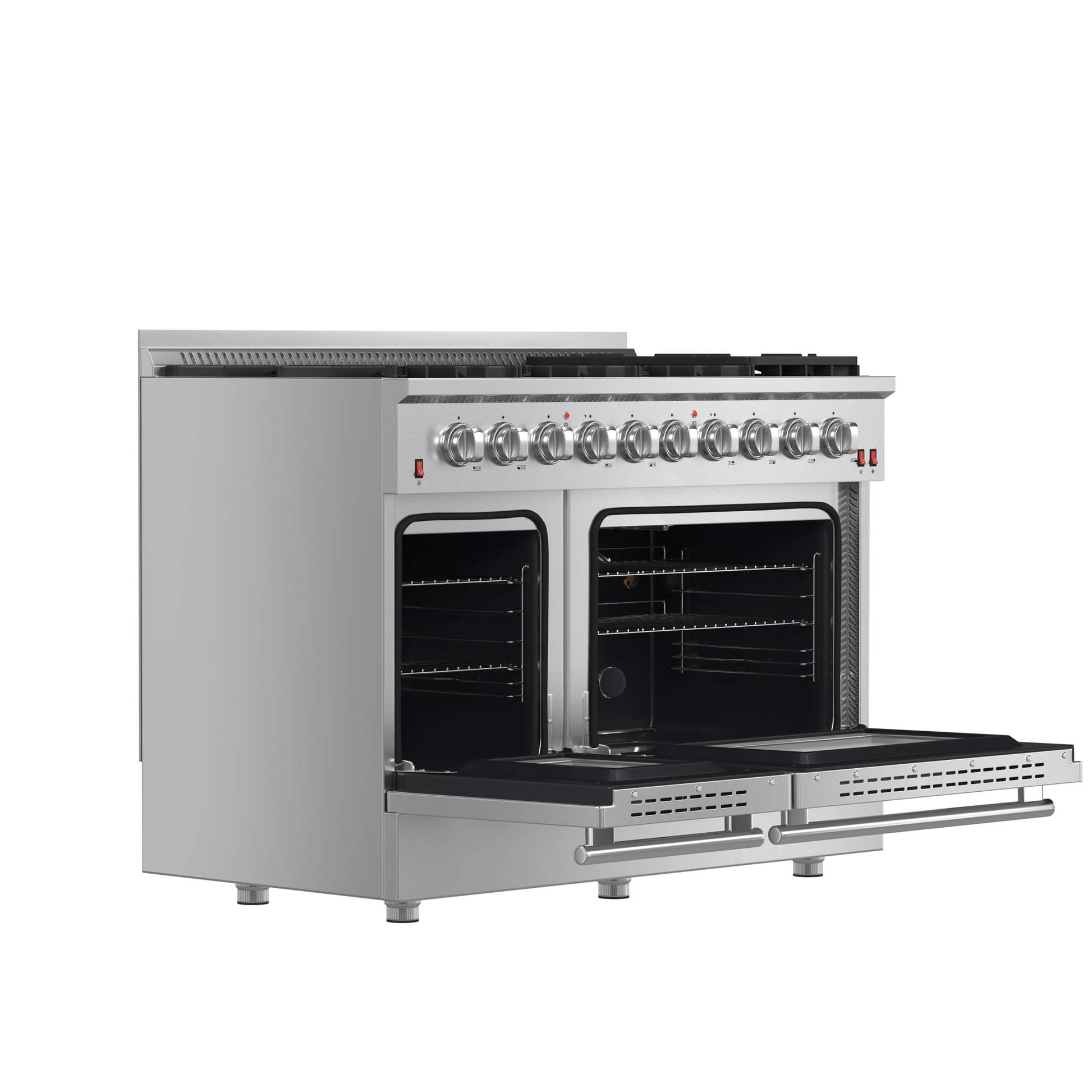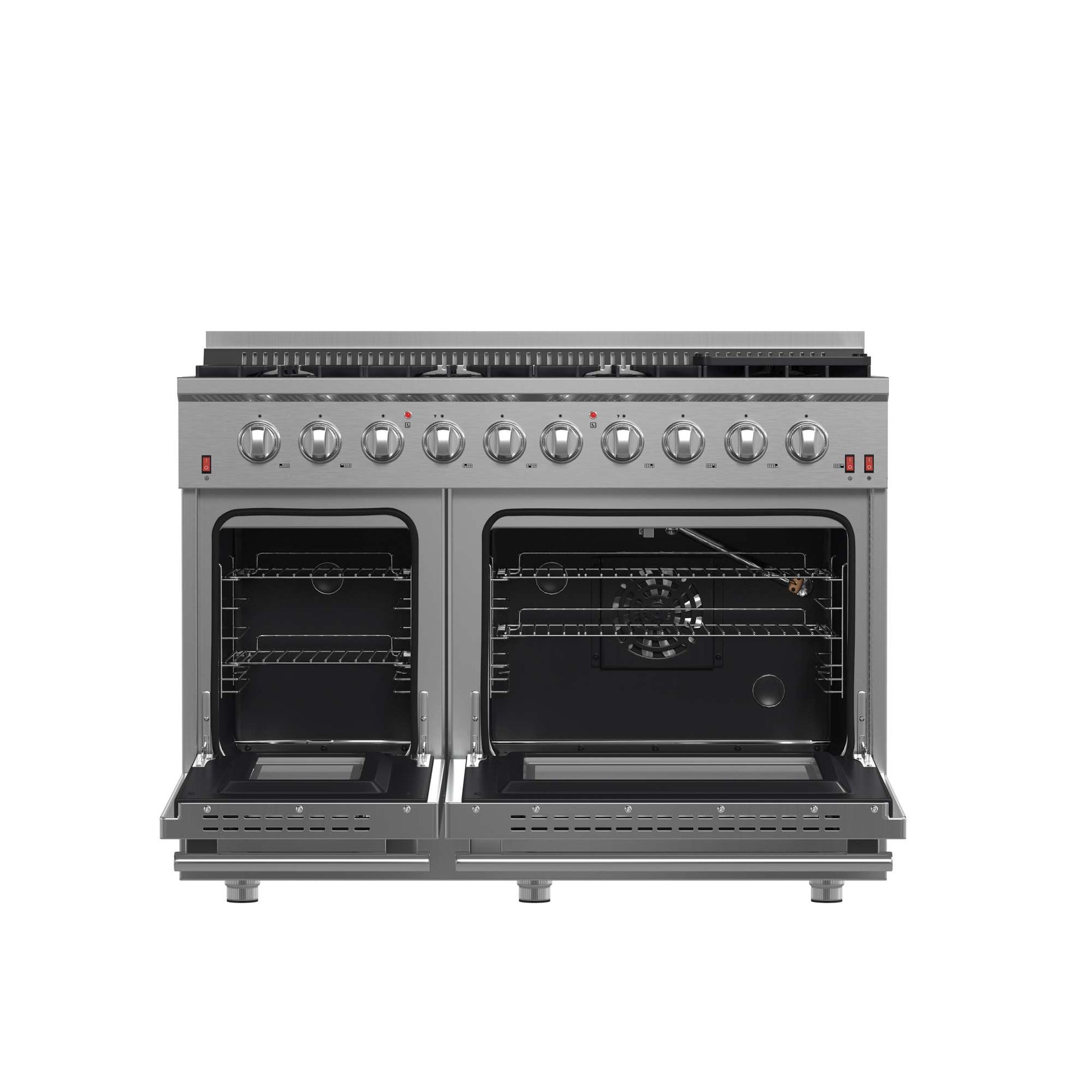 FORNO Galiano 48-inch Gas Range Stainless Steel, 8 Burners, 107,000 BTU, Griddle, 6.58 cu.ft. Double Oven