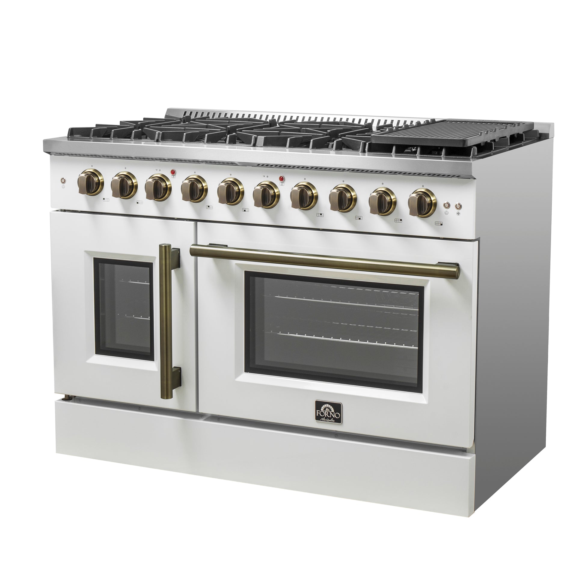 The 48-Inch Forno Galiano Gas Range redefines your kitchen with its professional-grade performance and timeless charm. Finished in sleek white with antique brass hardware, it brings sophistication and durability to any home. With 8 sealed burners delivering a total output of 107,000 BTU, including a 20,000 BTU dual-ring burner capable of simmering at 1,000 BTU, this range provides the versatility to handle any dish. Continuous cast iron grates ensure stability and effortless cookware movement across the durable enamel cooktop. Cook with confidence using the 4.32 cu.ft. convection main oven with 30,000 BTU total output, ideal for even baking and roasting. The 2.26 cu.ft. secondary oven, with its 14,000 BTU bake output, adds flexibility for simultaneous meal preparation. Both ovens feature enamel interiors for easy cleaning and three-layer glass doors for optimal heat retention and clear visibility. Designed for convenience, the range includes two racks per oven, a reversible griddle, and an LP conversion kit for adaptable installation. Backed by Forno's 2-year warranty, this gas range offers exceptional performance, elegant design, and peace of mind. Forno, Lower the cost of living.