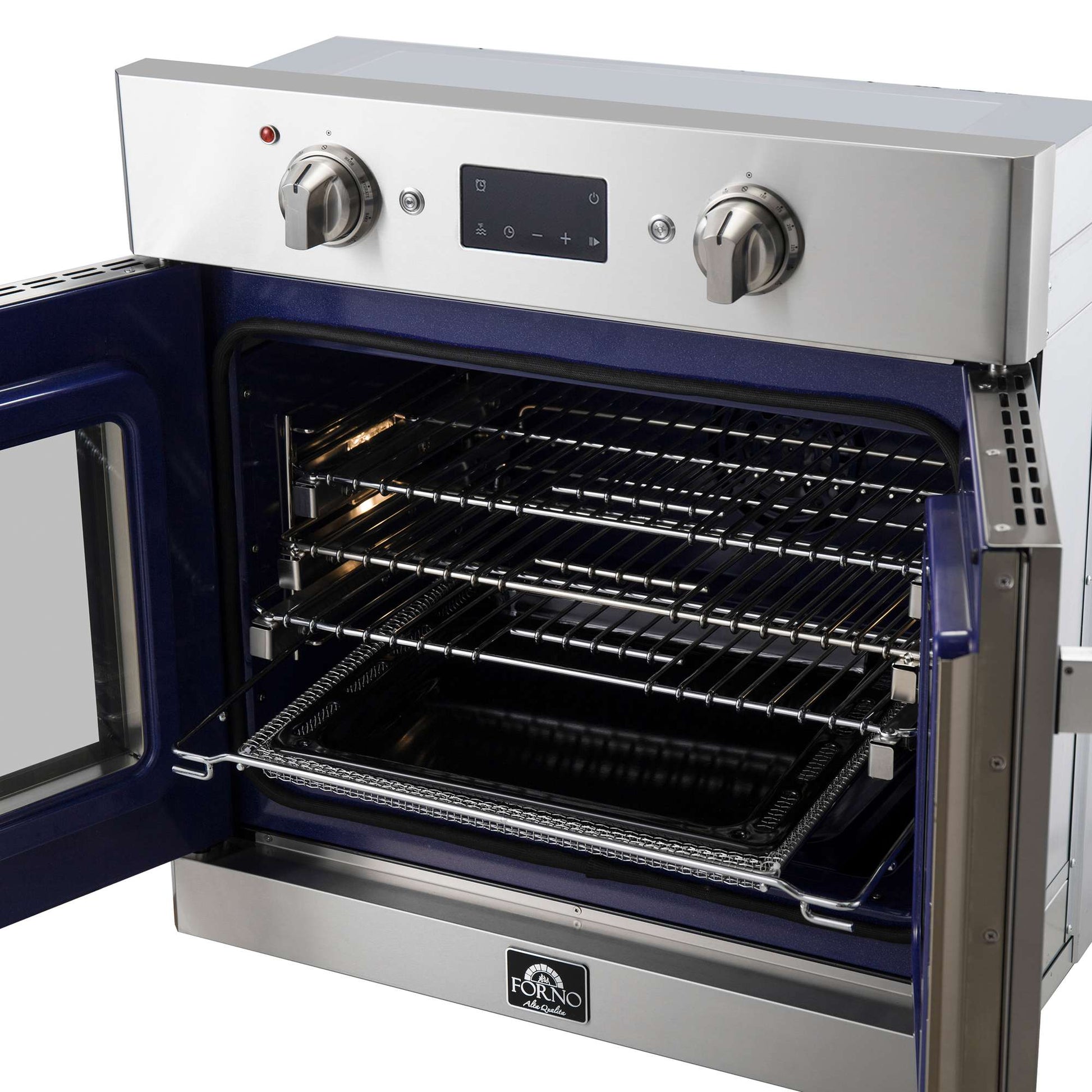 Introducing the 30 in. Gallico Wall Oven by Forno, an exquisite addition to your kitchen! This stainless steel beauty features French doors, revealing a generous 3.68 cu.ft. of space with a captivating blue-speckled interior. With sous vide, true convection, versatile bake functions, an air fry pan, and a drip tray included, it promises culinary perfection. The stainless steel telescopic racks ensure easy access. Elevate your cooking experience with this chic and innovative Gallico Wall Oven, marrying culinary prowess with timeless elegance. Transform your kitchen with a touch of sophistication and functionality.