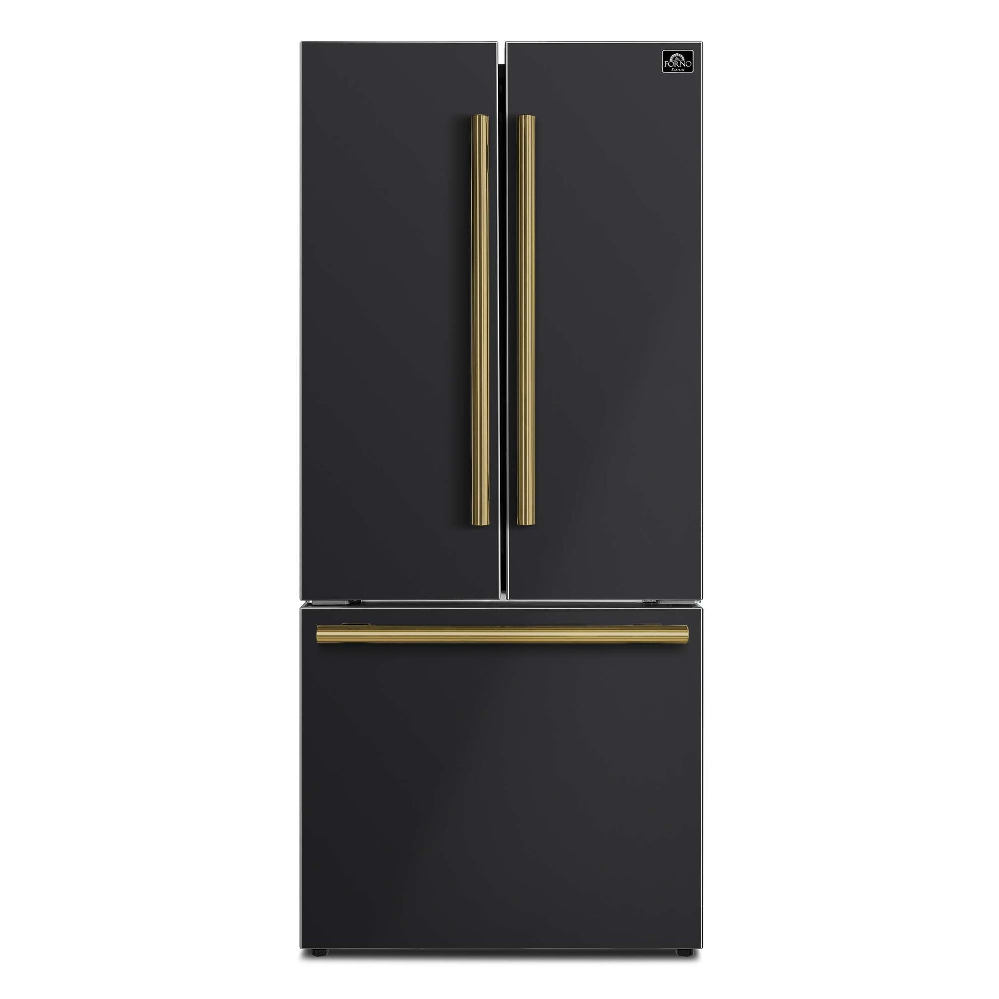 The Forno Espresso Gallipoli 31 Inch Black French Door refrigerator combines style and functionality with its frost-free multi-air flow cooling system, offering a spacious 17.5 cu.ft. capacity. Adjustable shelving ensures versatile grocery storage, complemented by a compressor inverter for energy efficiency, quiet operation, and precise temperature control. The LED touch panel provides convenient access and control. The fresh food storage (12.4 cu.ft.) features three glass shelves (two adjustable), two crisper drawers, and ample door storage. The 5.1 cu.ft. freezer boasts organized storage with one pull-out drawer that contains 2 drawer, a removable ice bucket and a high-capacity automatic ice maker producing up to 4 pounds of ice daily. This refrigerator is ENERGY STAR Certified for efficiency, and high-efficiency LED lighting minimizes food spoilage. Antique brass handles add an elegant finishing touch to this high-performing and stylish appliance.