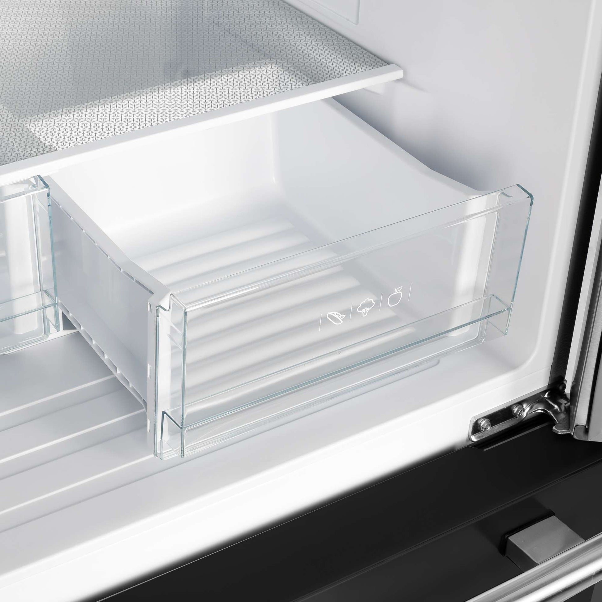 * The fresh food compartment is equipped with 3 glass shelves, 6 door bins, and 2 drawers.