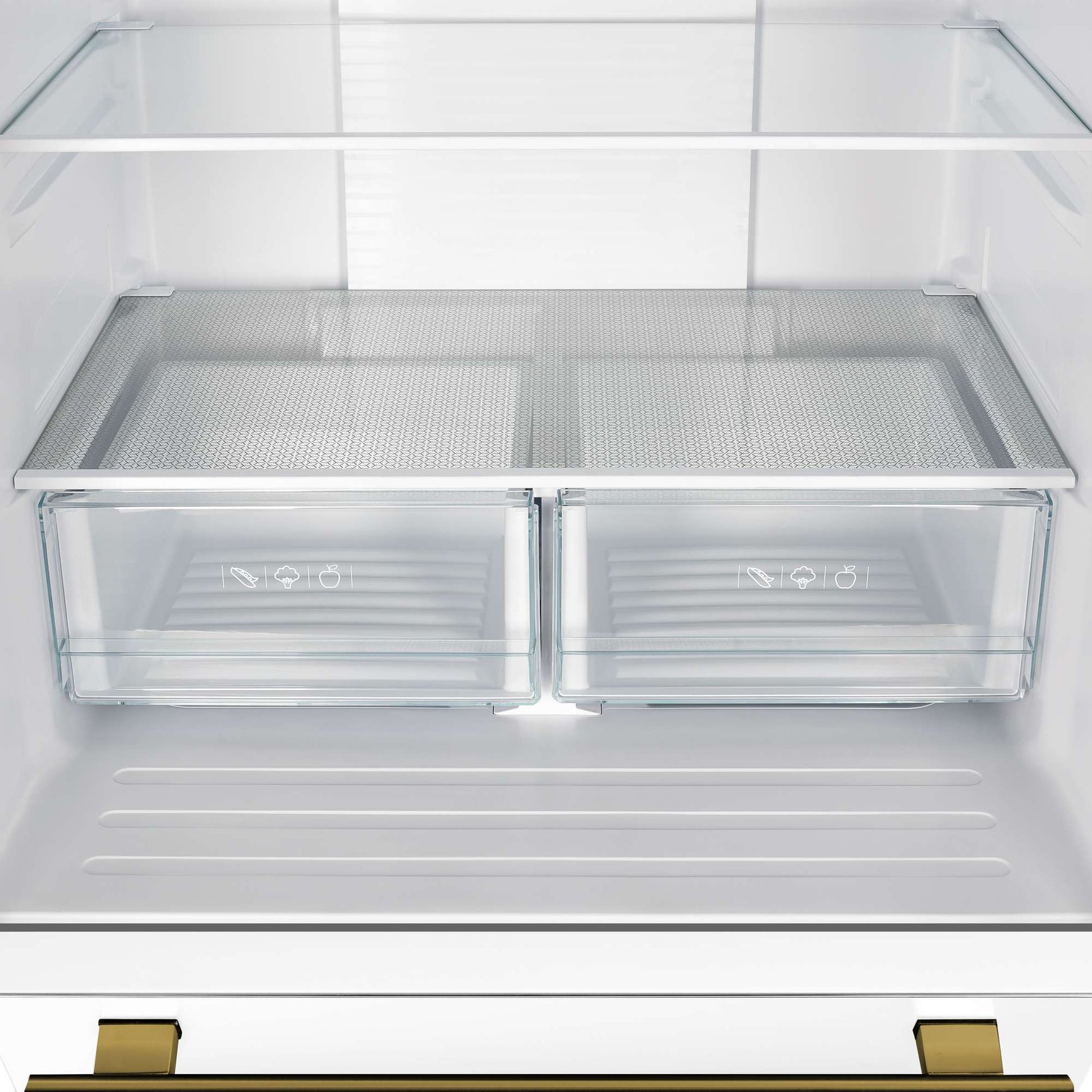 The Forno Espresso Gallipoli 31 Inch White French Door refrigerator combines style and functionality with its frost-free multi-air flow cooling system, offering a spacious 17.5 cu.ft. capacity. Adjustable shelving ensures versatile grocery storage, complemented by a compressor inverter for energy efficiency, quiet operation, and precise temperature control. The LED touch panel provides convenient access and control. The fresh food storage (12.4 cu.ft.) features three glass shelves (two adjustable), two crisper drawers, and ample door storage. The 5.1 cu.ft. freezer boasts organized storage with one pull-out drawer that contains 2 drawer, a removable ice bucket and a high-capacity automatic ice maker producing up to 4 pounds of ice daily. This refrigerator is ENERGY STAR Certified for efficiency, and high-efficiency LED lighting minimizes food spoilage. Antique brass handles add an elegant finishing touch to this high-performing and stylish appliance.