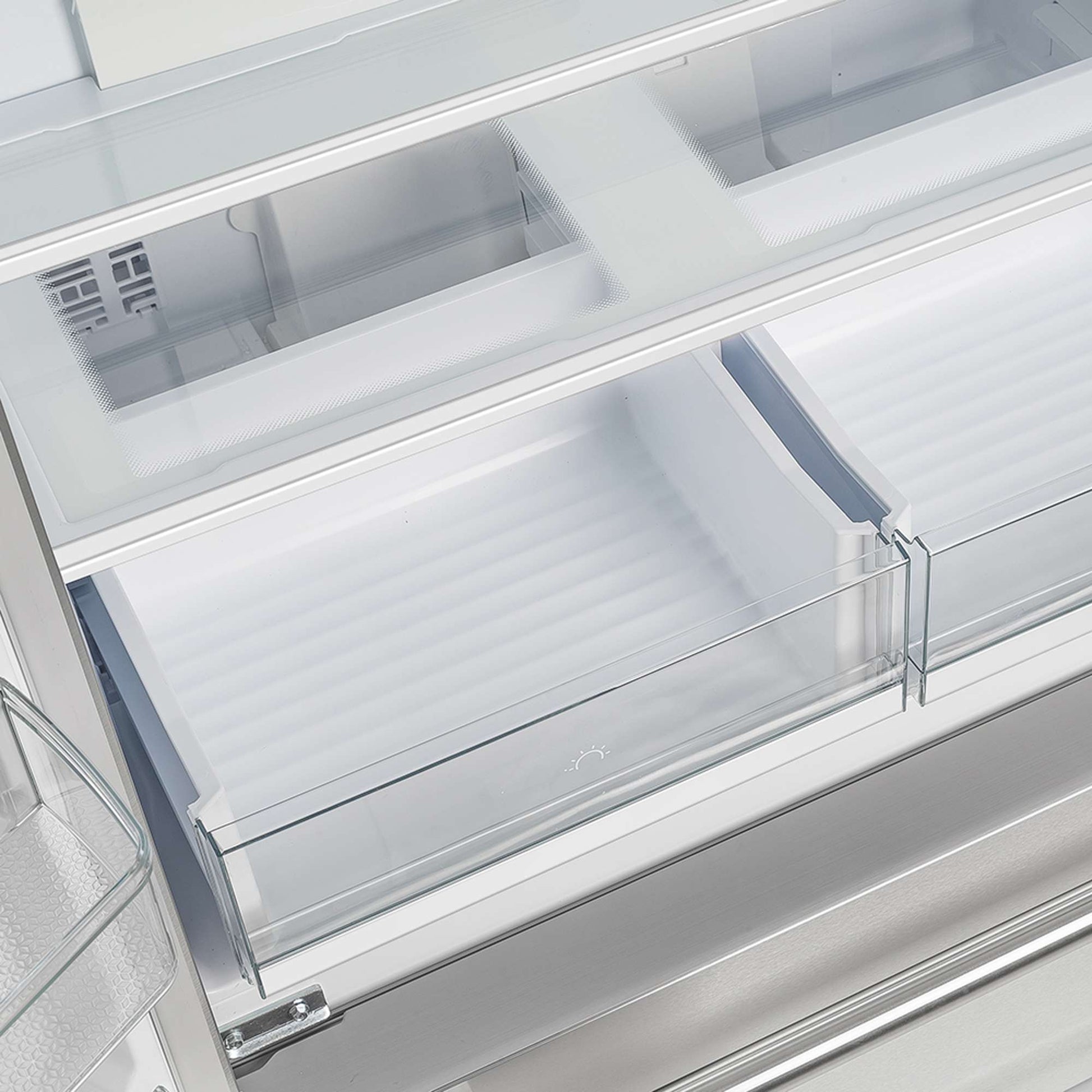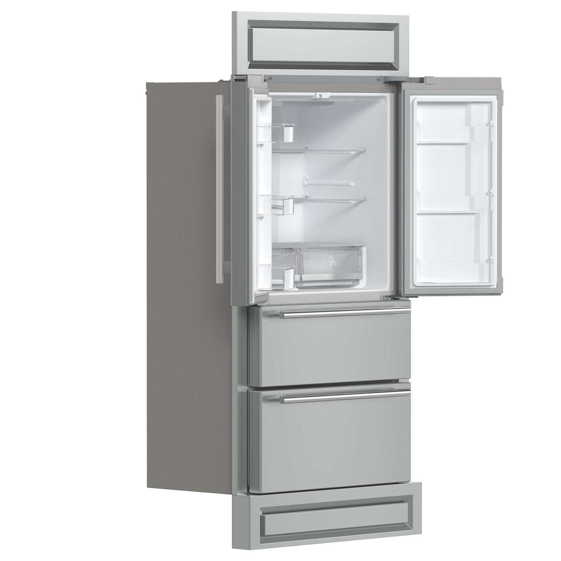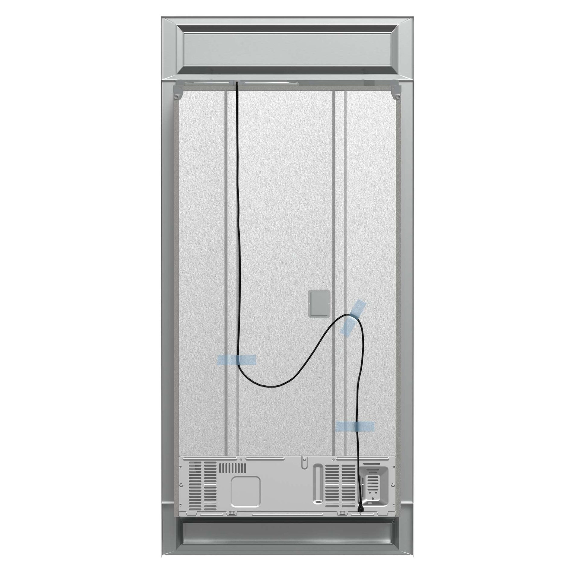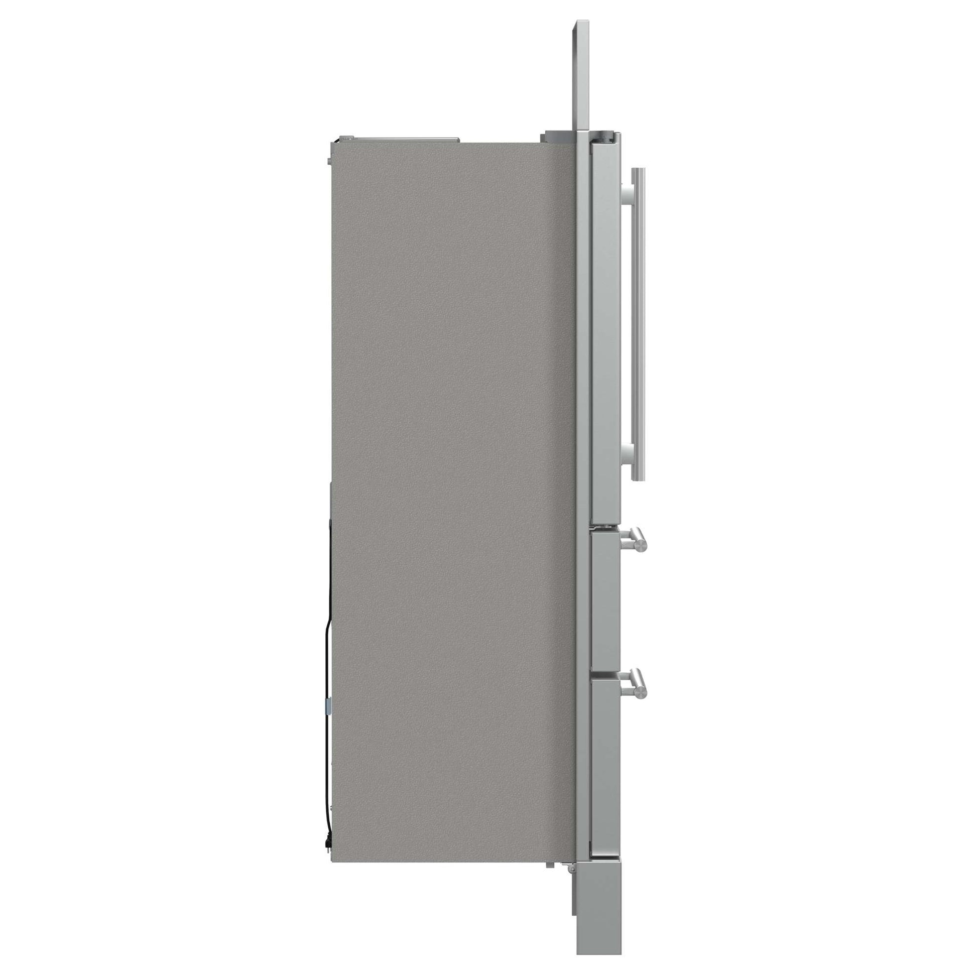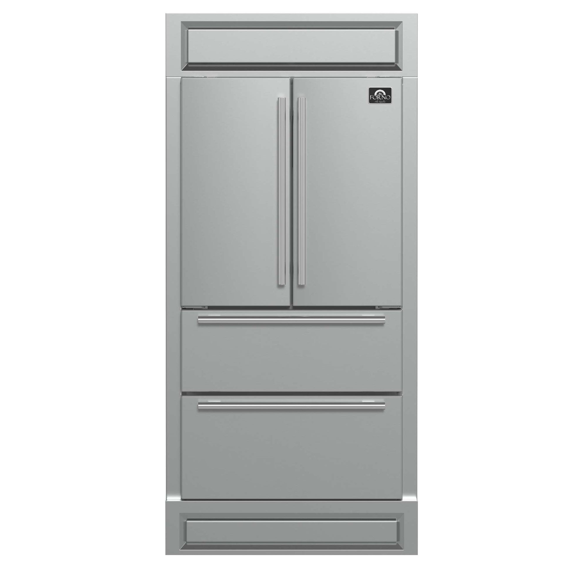 The Forno Moena 36 Inch Stainless-Steel French Door refrigerator upgraded to a 40 Inch built-in unit featuring a decorative grill for space optimization and seamless integration into your kitchen decor. Its compressor inverter ensures energy efficiency, quiet operation, and precise temperature control, maintaining optimal freshness. The frost-free multi-air flow cooling system offers a 19.2 cu.ft. capacity with adjustable shelving for versatile grocery storage. The LED touch panel provides easy access and control. The fresh food storage (12.1 cu.ft.) includes three glass shelves, two adjustable, two crisper drawers, and ample door storage. The 7.2 cu.ft. freezer offers organized storage with two pull-out drawers, a slide-out tray, and an automatic ice maker able to procude up to 4 pounds daily. ENERGY STAR Certified for efficiency, it features high-efficiency LED lighting to minimize food spoilage.