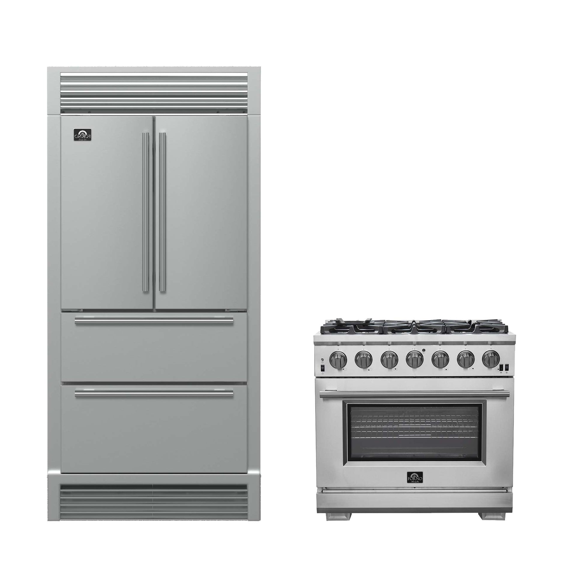 FORNO Premium 2-Piece Kitchen Bundle - Galiano 48" Stainless Steel Range, Forno Moena 36" French Door 19.2 cu. ft Stainless Steel Refrigerator, with Decorative Grill - 40"es Wide
