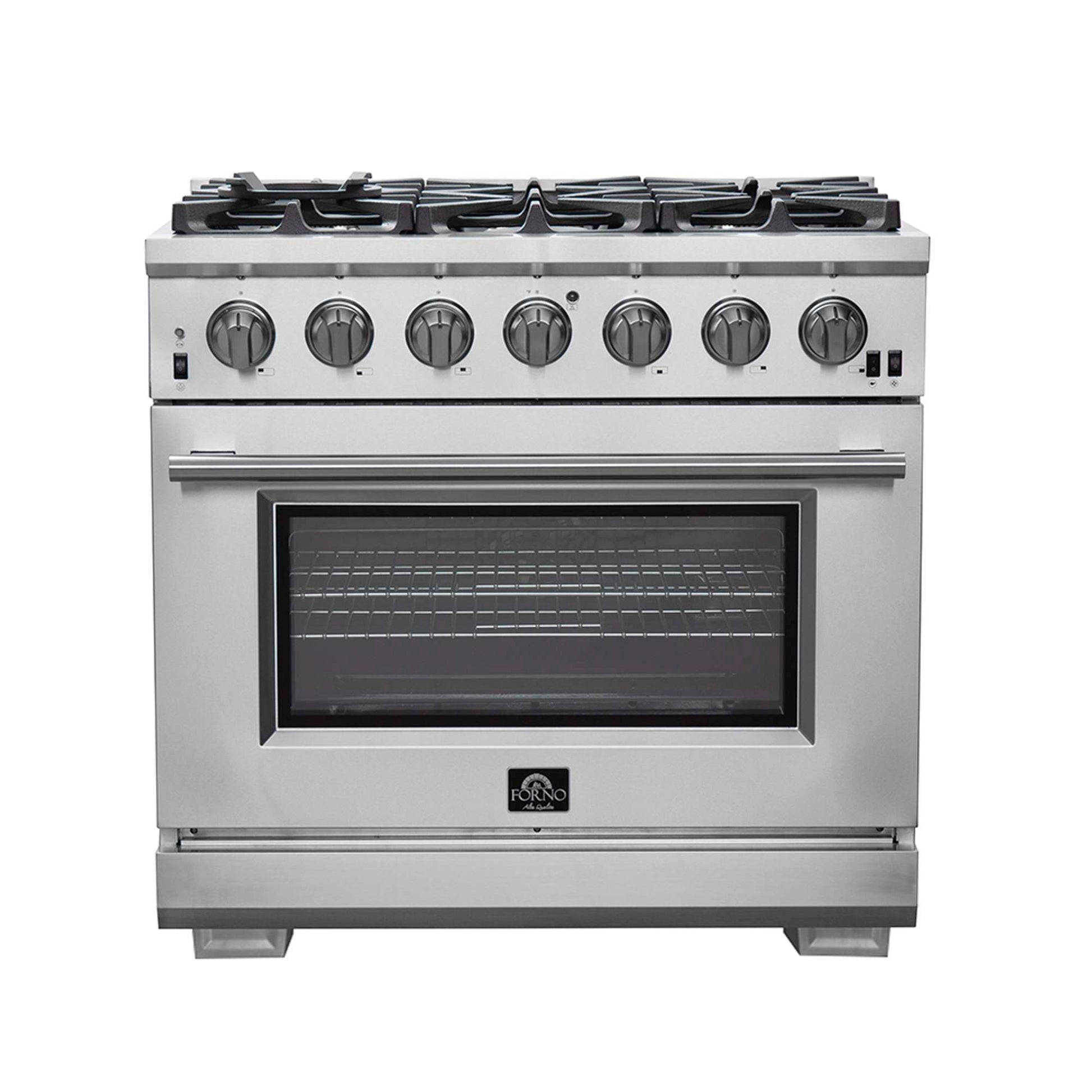 Upgrade your kitchen with the FORNO Premium 2-Piece Kitchen Bundle - Galiano 48" Stainless Steel Range, Forno Moena 36" French Door 19.2 cu. ft Stainless Steel Refrigerator, with Decorative Grill - 40"es Wide. This bundle includes the FFSGS6260-36, featuring powerful performance and elegant design, and the FFRBI1820-40SG, known for its spacious capacity and energy-efficient cooling system. Perfect for a modern kitchen, these appliances offer a blend of style and functionality that will elevate your cooking experience.