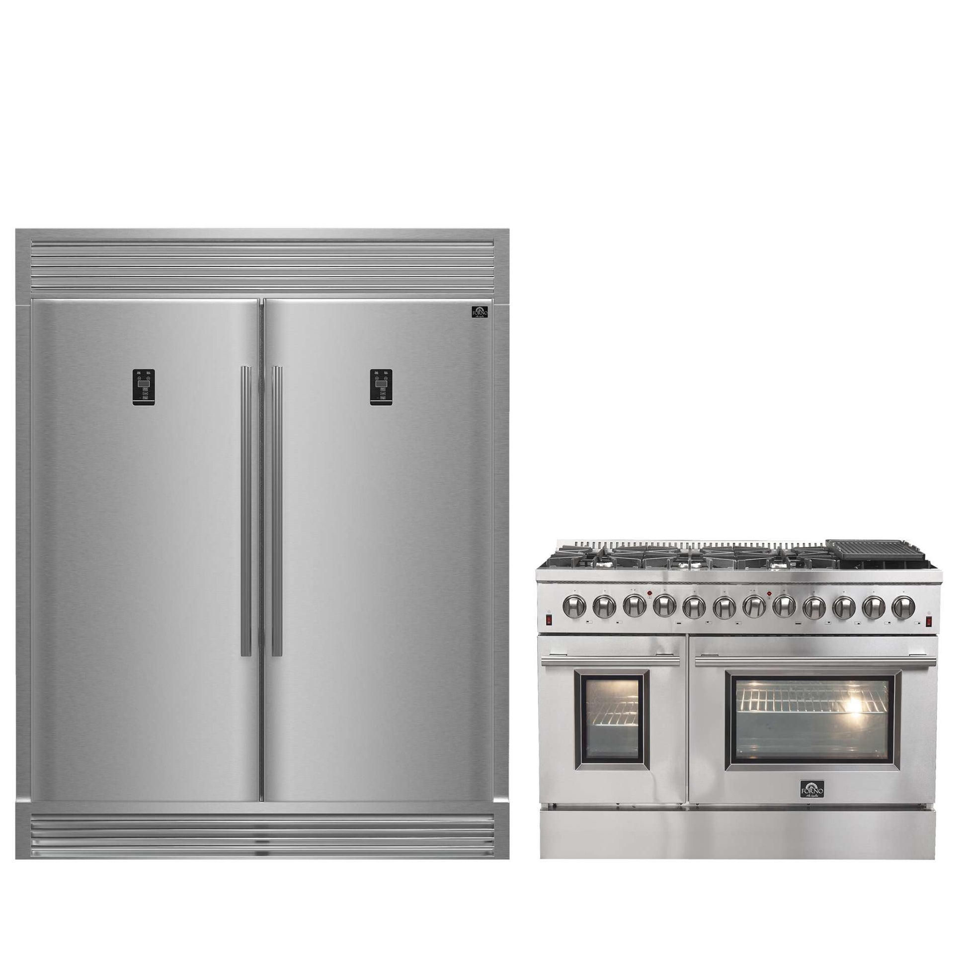 FORNO Premium 2-Piece Kitchen Bundle - Galiano 48" Dual Fuel Stainless Steel Range, Rizzuto 60" W. Dual Combo Convertible Refrigerator.