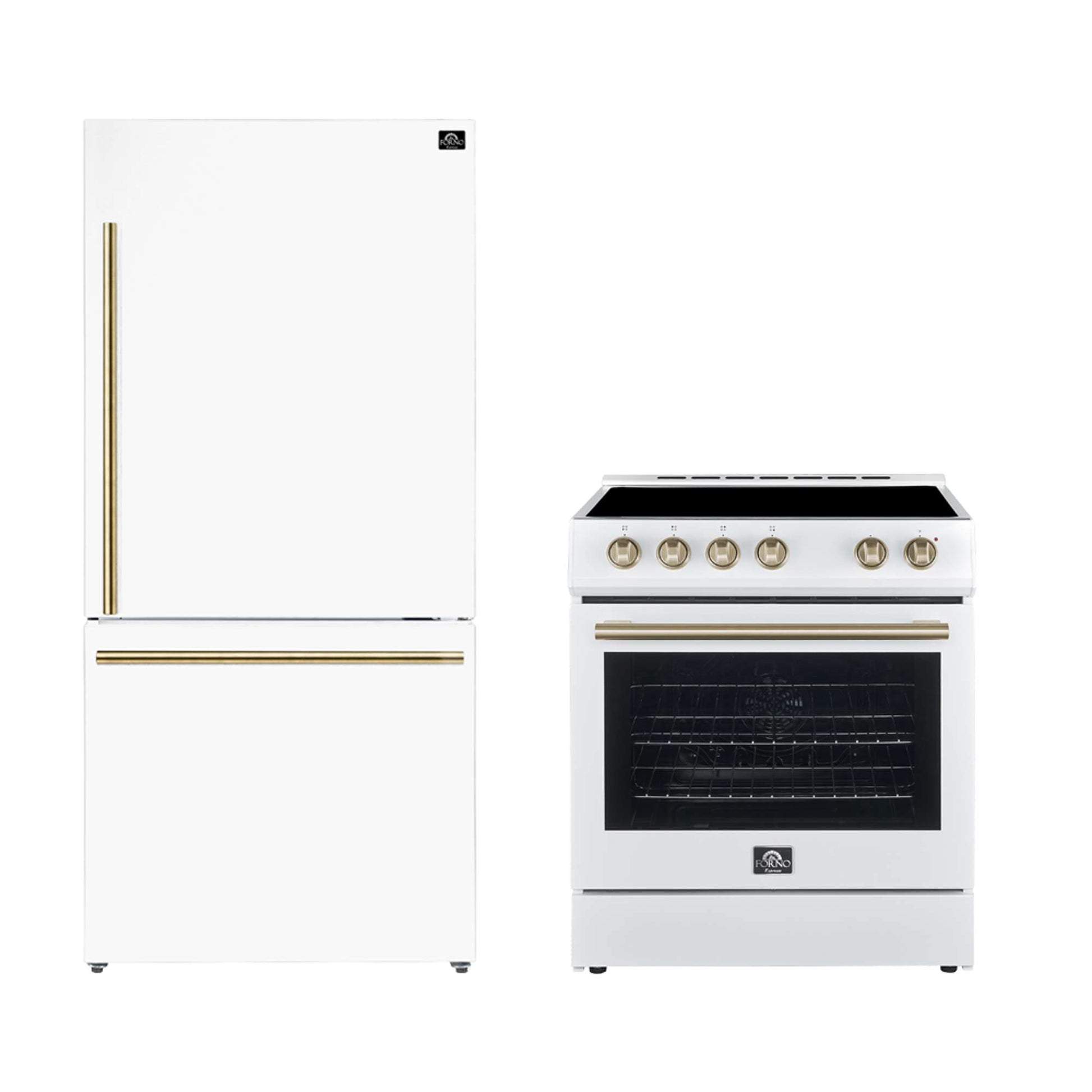 FORNO Premium 2-Piece Kitchen Bundle - Leonardo Espresso 30" White Range, 31" White Bottom Freezer Refrigerator