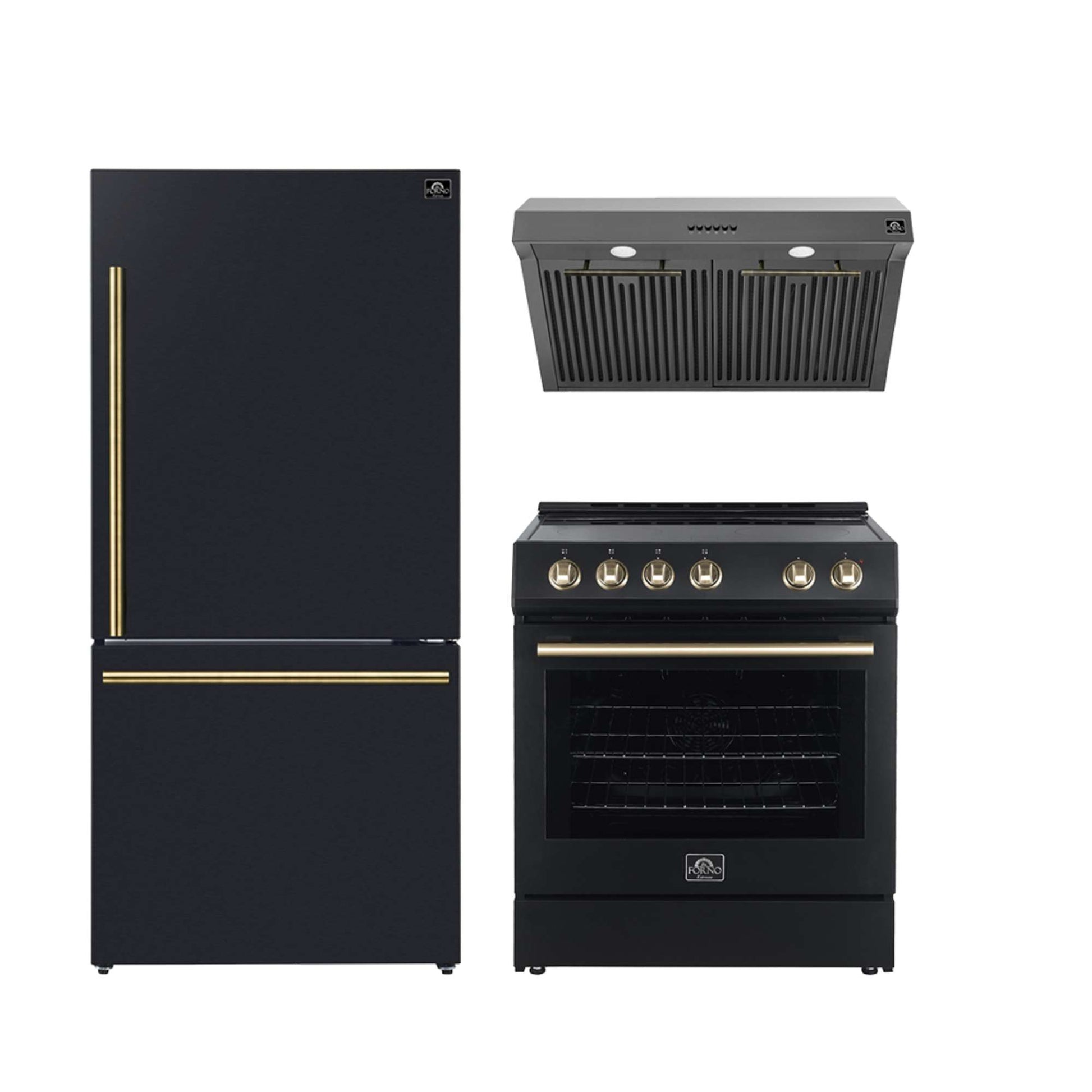 FORNO Premium 3-Piece Kitchen Bundle - Leonardo Espresso 30" Black Range, 30" Black Range Hood, 31" Black Bottom Freezer Refrigerator