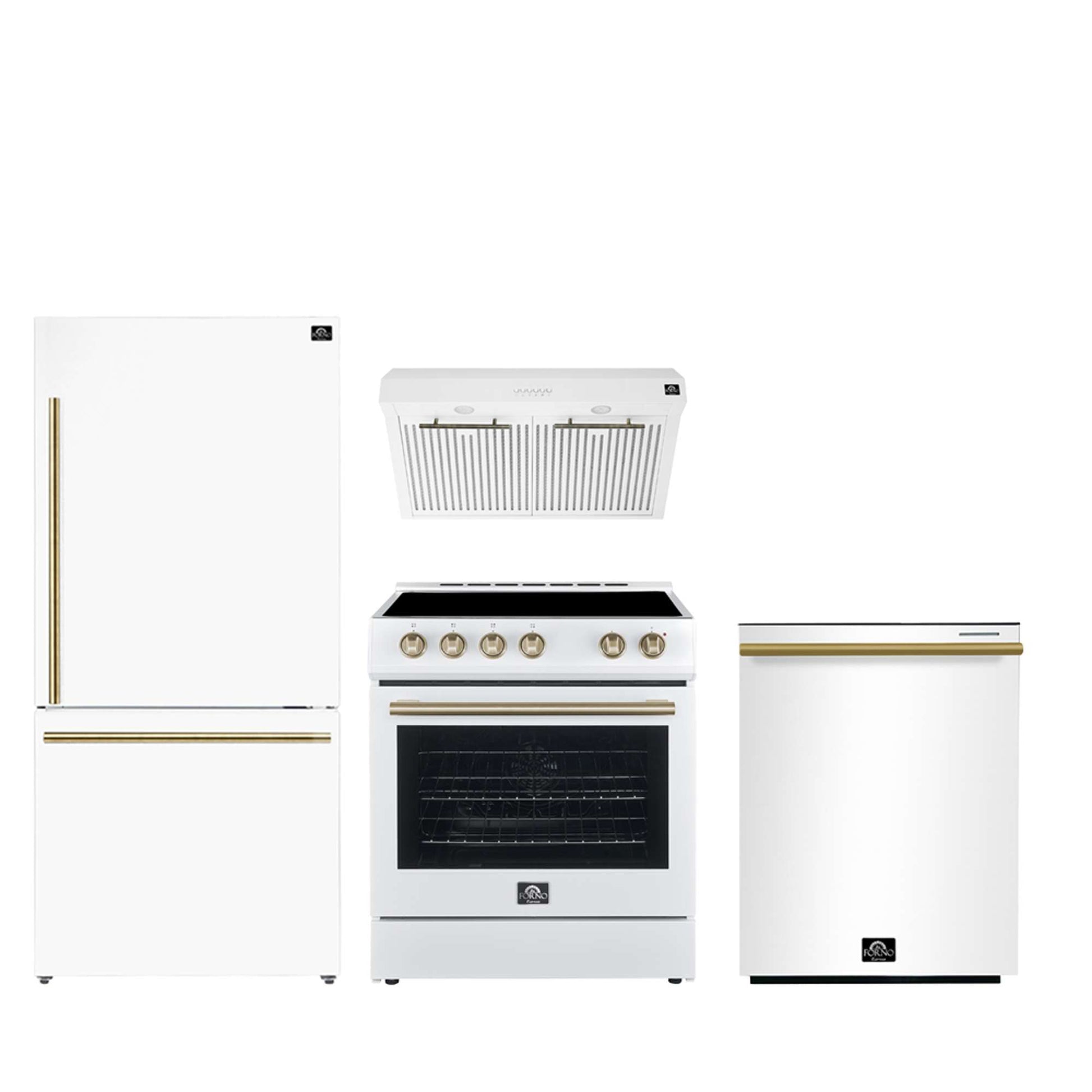 FORNO Premium 4-Piece Kitchen Bundle - Leonardo Espresso 30" White Range, 30" White Range Hood, 31" White Bottom Freezer Refrigerator, 24" White Built-In Dishwasher