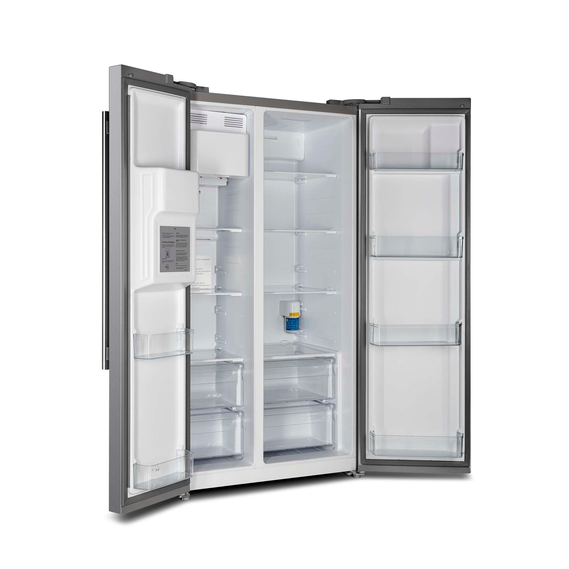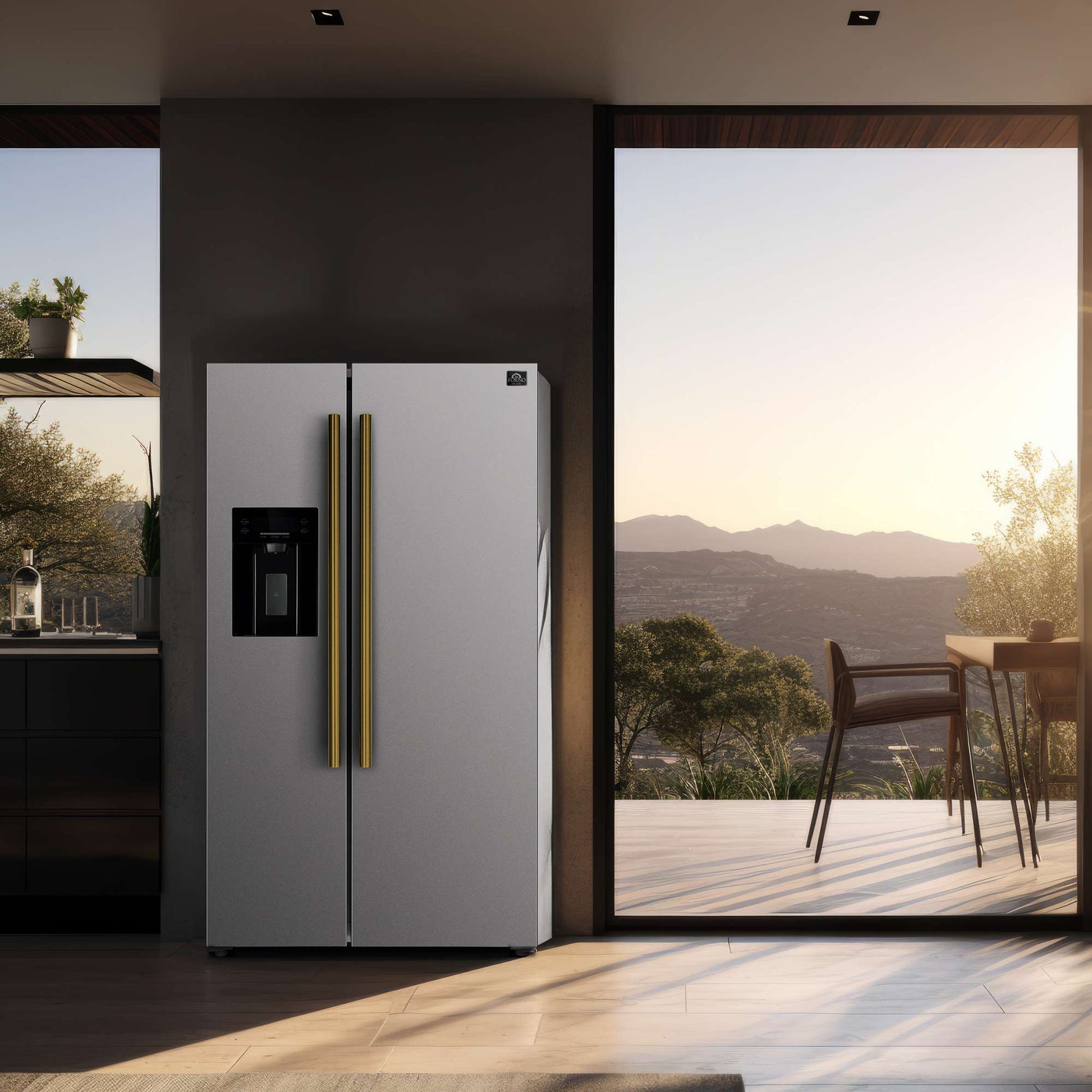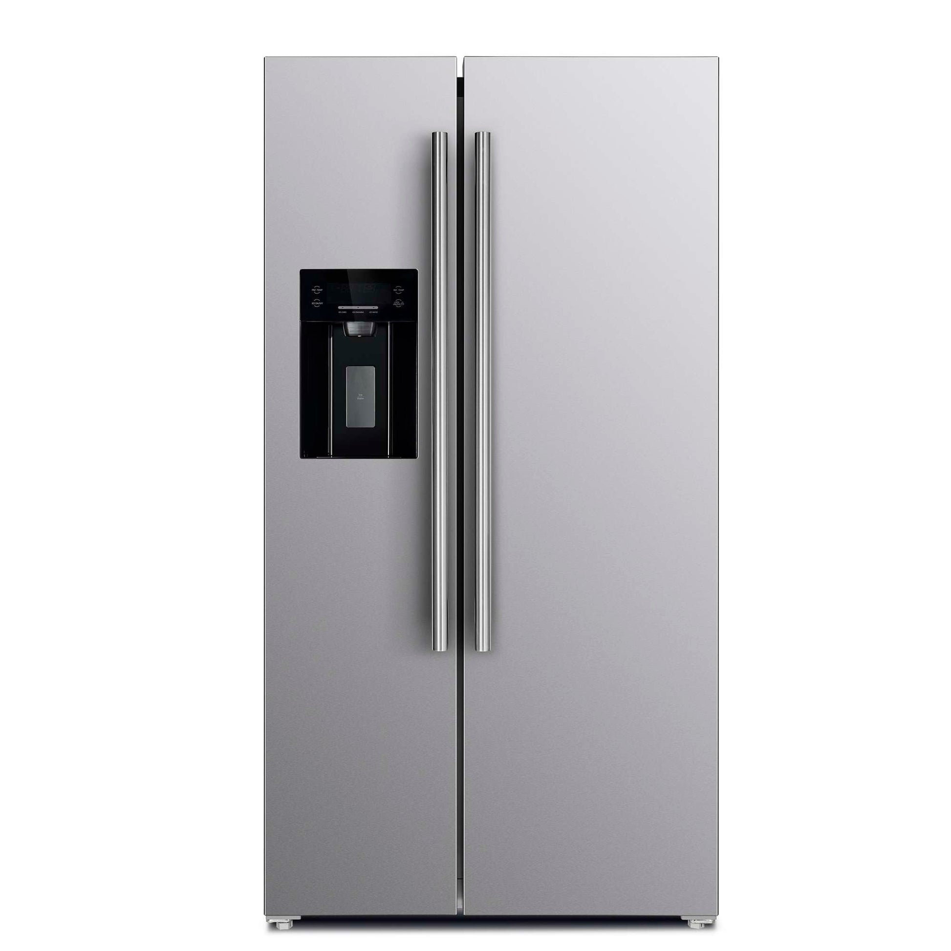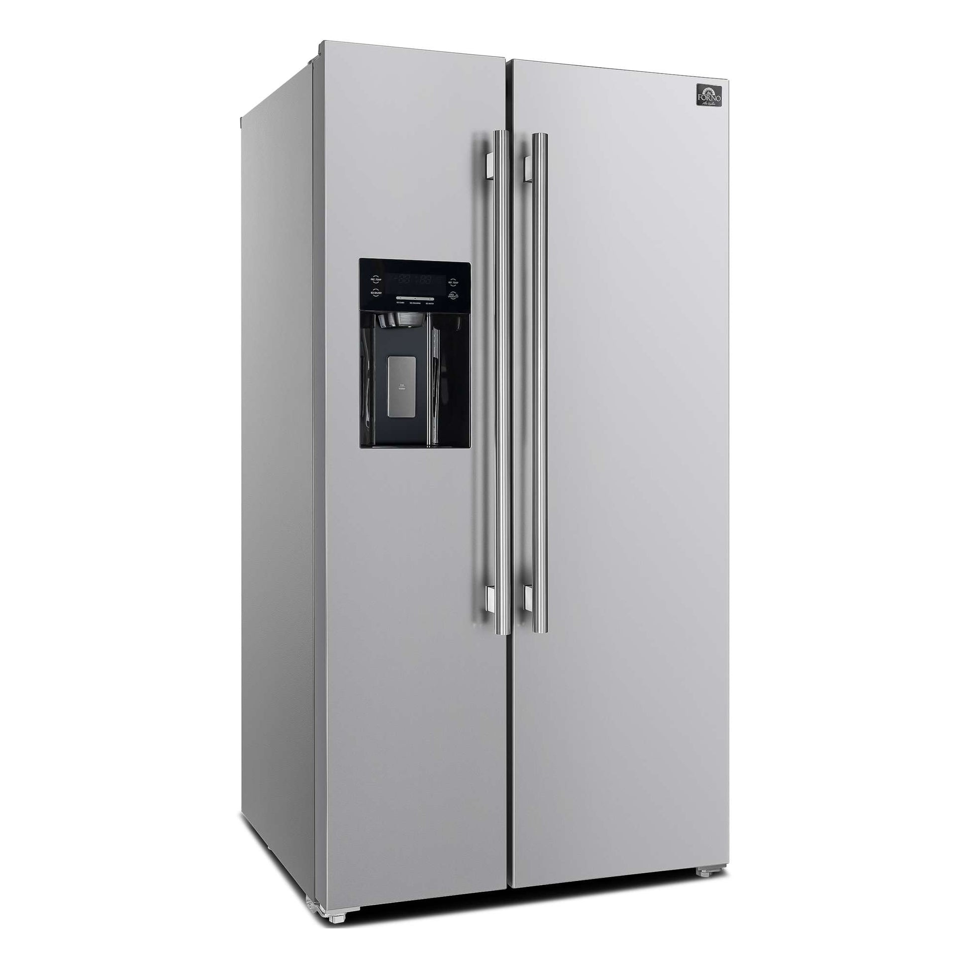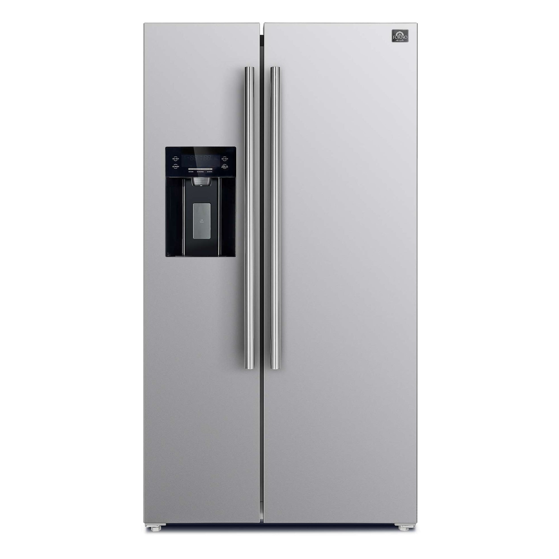 The Forno Salerno 36 Inch side-by-side stainless steel refrigerator delivers optimal performance and maximizes storage efficiency. The compressor inverter guarantees energy efficiency, quiet operation, and precise temperature control for optimal freshness. With a frost-free multi air flow cooling system, this appliance boasts a 20 cu.ft. capacity and adjustable shelving for versatile grocery storage. Experience convenience with the water and ice dispenser, featuring a touch screen control for intuitive access to ice options and temperature controls. The Fresh Food storage capacity of 13.48 cu.ft. includes 4 spill-proof shelves, 3 door bins, 1 gallon bin, and 2 crisper drawers. The 6.53 cu.ft. Freezer storage offers 3 spill-proof shelves, 2 door bins, and 2 storage drawers, ensuring optimal organization. This refrigerator is ENERGY STAR Certified for efficiency, and high-efficiency LED lighting minimizes food spoilage.