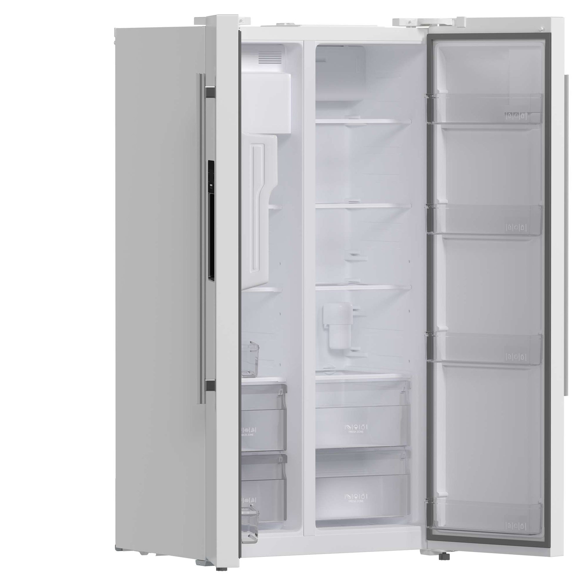 The Forno Salerno 36 Inch side-by-side white refrigerator delivers optimal performance and maximizes storage efficiency. The compressor inverter guarantees energy efficiency, quiet operation, and precise temperature control for optimal freshness. With a frost-free multi air flow cooling system, this appliance boasts a 20 cu.ft. capacity and adjustable shelving for versatile grocery storage. Experience convenience with the water and ice dispenser, featuring a touch screen control for intuitive access to ice options and temperature controls. The Fresh Food storage capacity of 13.48 cu.ft. includes 4 spill-proof shelves, 3 door bins, 1 gallon bin, and 2 crisper drawers. The 6.53 cu.ft. Freezer storage offers 3 spill-proof shelves, 2 door bins, and 2 storage drawers, ensuring optimal organization. This refrigerator is ENERGY STAR Certified for efficiency, and high-efficiency LED lighting minimizes food spoilage. Antique brass handles add an elegant finishing touch to this high-performing and stylish appliance.