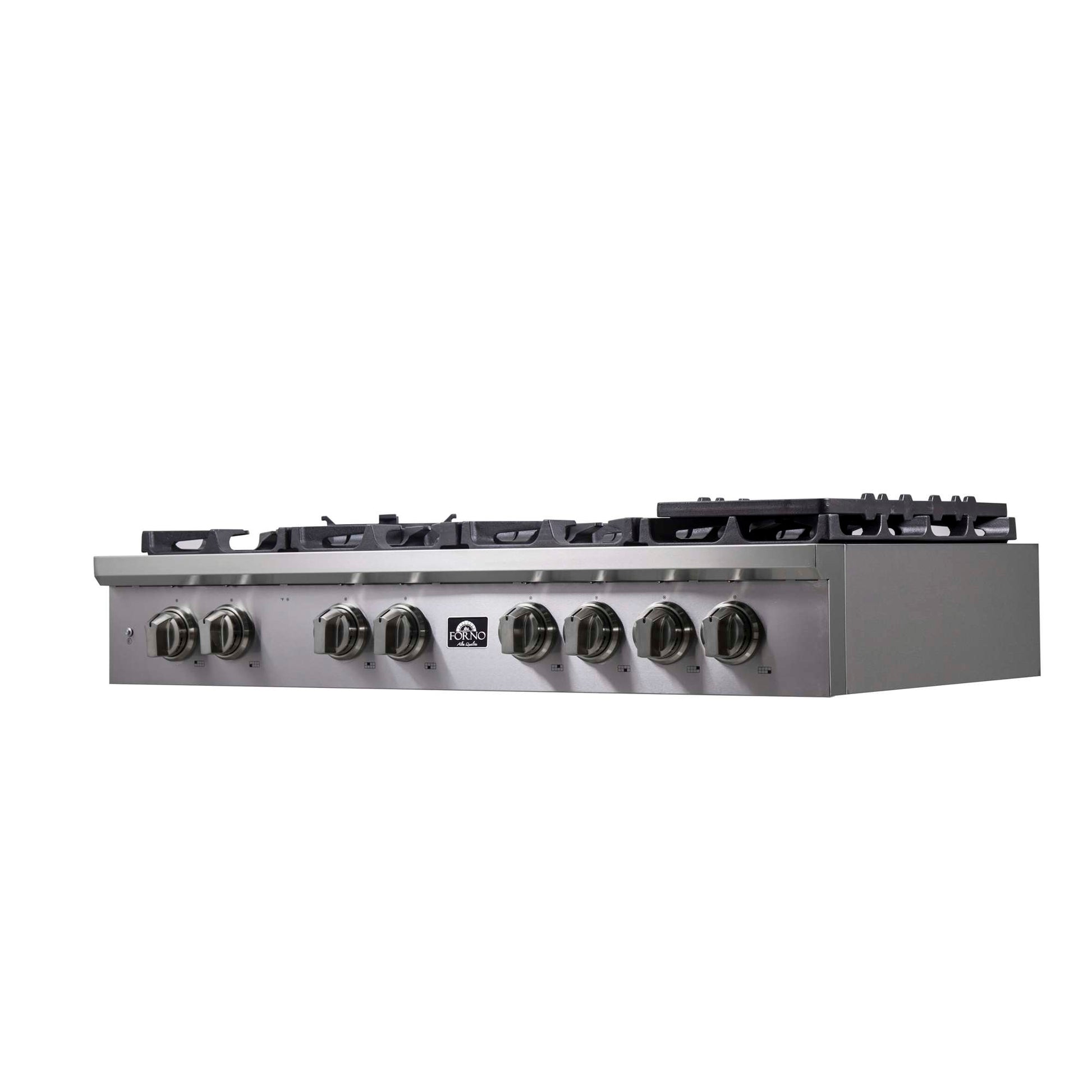 The Forno Spezia 48 Inch gas rangetop features a versatile configuration with 8 sealed dual brass burners totaling 160,000 BTUs, ready for any culinary challenge. Continuous cast iron grates simplify pan movement, while illuminated zinc control knobs offer precise gas cooking control. Includes auto-ignition, griddle, wok-ring, and LP conversion kit. Crafted from heavy-duty 304 stainless steel for easy cleaning, complementing any kitchen design alongside other Forno appliances.