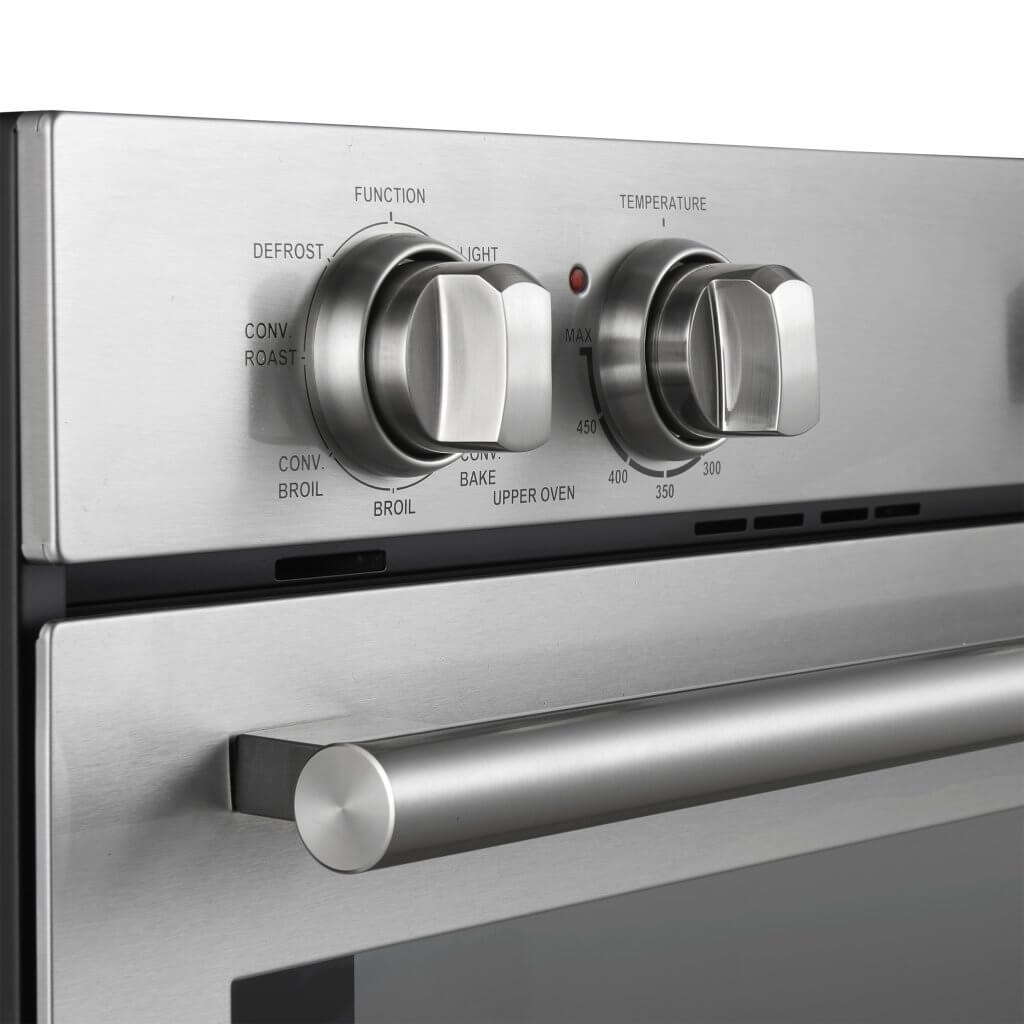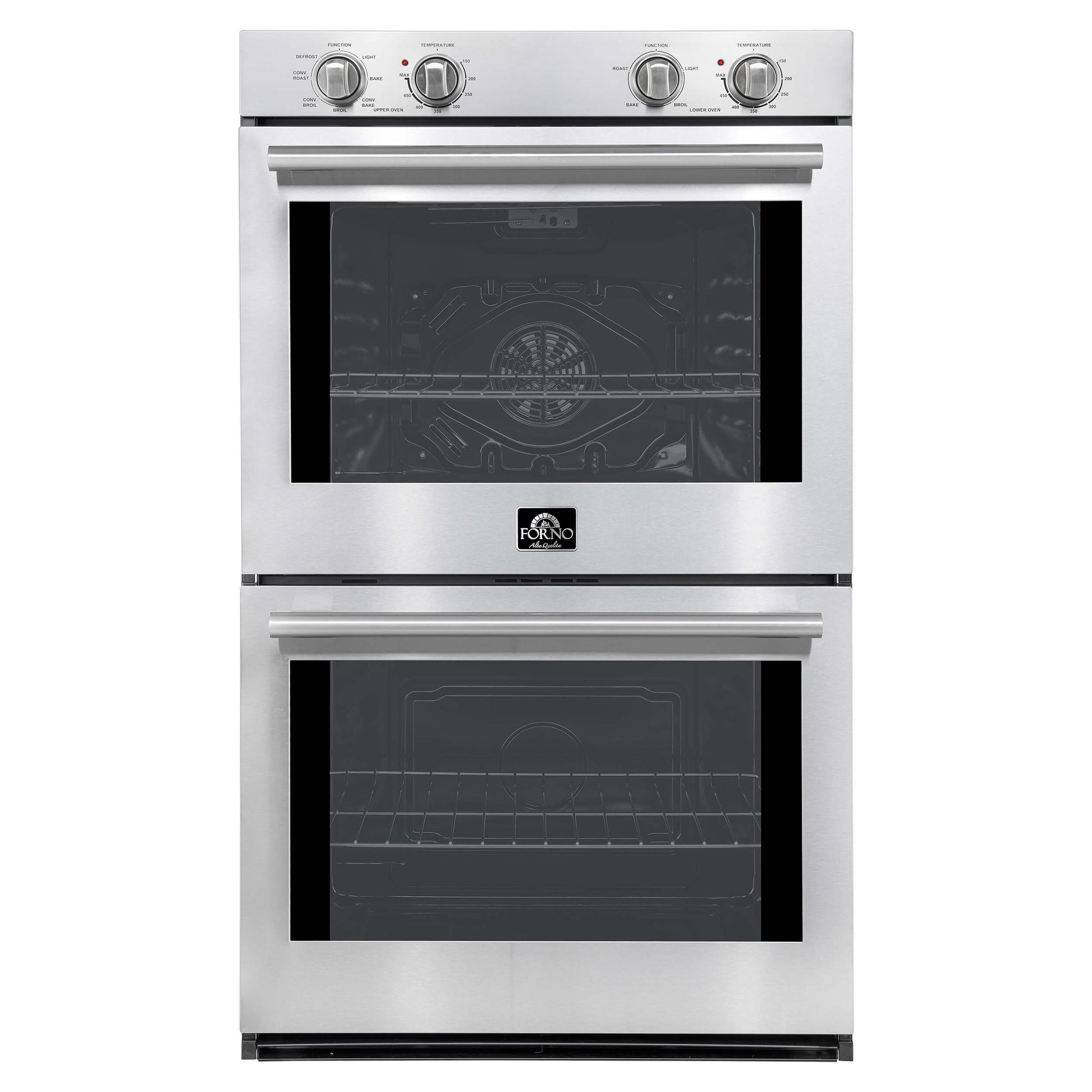 The Forno Vomero 30" Double Wall Oven is perfect for everything from weeknight meals to holiday feasts. With dual 5 cu.ft. ovens (10 cu.ft. total), you can cook multiple dishes at once for seamless family gatherings. The upper oven offers 6 versatile cooking modes: Bake, Conv Bake, Broil, Conv Broil, Conv Roast, and Defrost, using a 2000W broiler, 1500W bake element, and 50W convection fan for even, efficient heating. The lower oven, equipped with a 2000W broiler and 1500W bake element, is a traditional oven without a convection fan—ideal for classic roasting and baking. Both ovens feature 6-layer shelves for customizable rack positioning and include an intuitive mechanical knob control panel for easy temperature adjustments. The inner enamel surface and hidden heating elements make cleaning simple while maintaining a sleek look. Complete with 3 chrome-plated racks for versatile cooking needs, this oven is backed by a 2-year in-house warranty. Lower the cost of living with Forno.