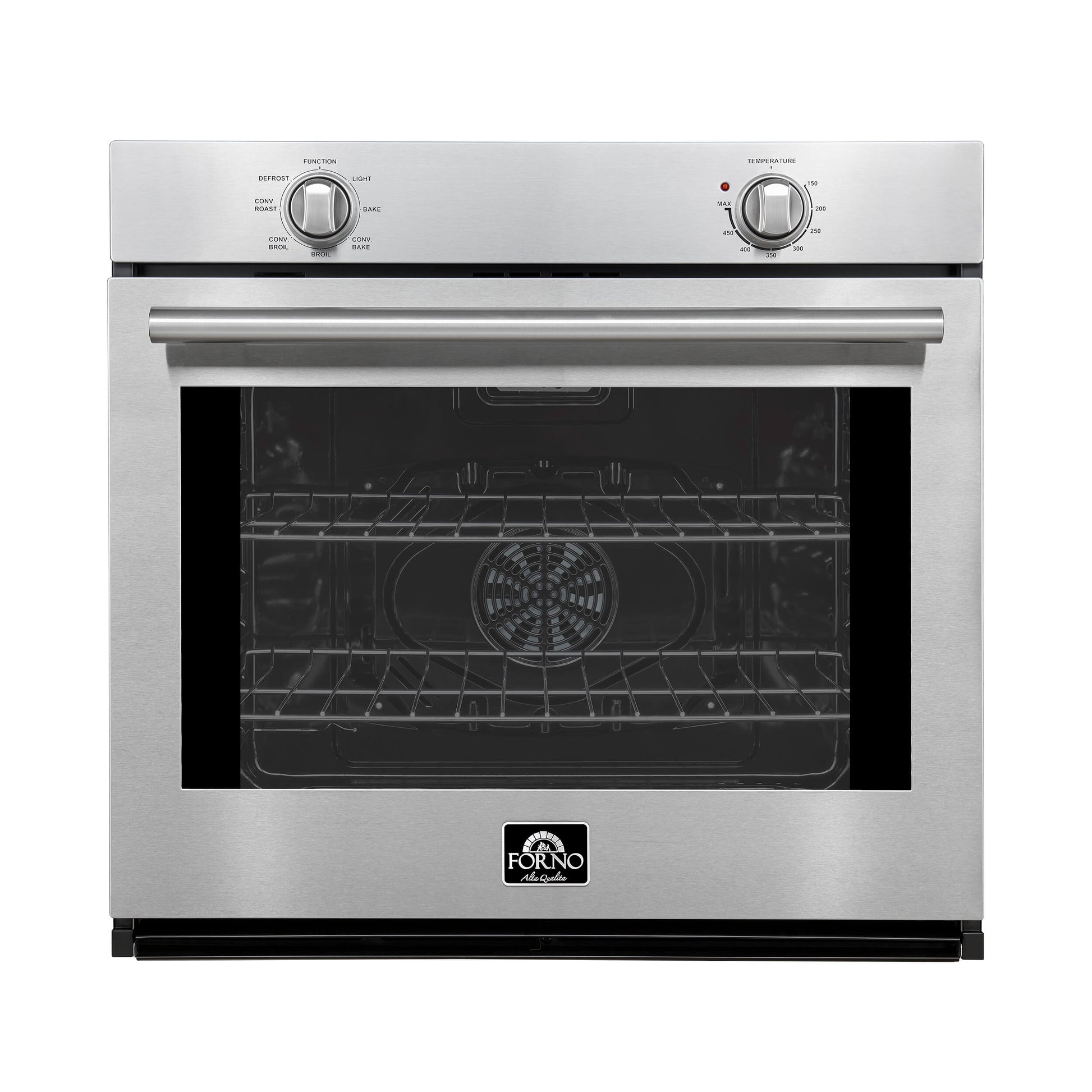The Forno Vomero 30" Single Wall Oven is perfect for anything from intimate dinners to family gatherings. With 6 cooking functions—Bake, Conv Bake, Broil, Conv Broil, Conv Roast, and Defrost—it offers the flexibility for any dish. A 2000W broiler, 1500W bake element, and 50W convection fan ensure fast, even heating. The 5 cu.ft. capacity fits baking sheets up to 23 x 15.75 inches. The mechanical knob control panel makes adjusting settings simple, while two 25W halogen lights allow easy monitoring. The sleek stainless steel design and triple-layer window enhance safety and style. Ideal for built-in or under-cooktop installation, it features an easy-to-clean enamel interior with a hidden element. Complete with 2 chrome-plated racks and an adjustable shelf, the Forno Vomero combines convenience and performance. Backed by a 2-year in-house warranty. Lower the cost of living with Forno.